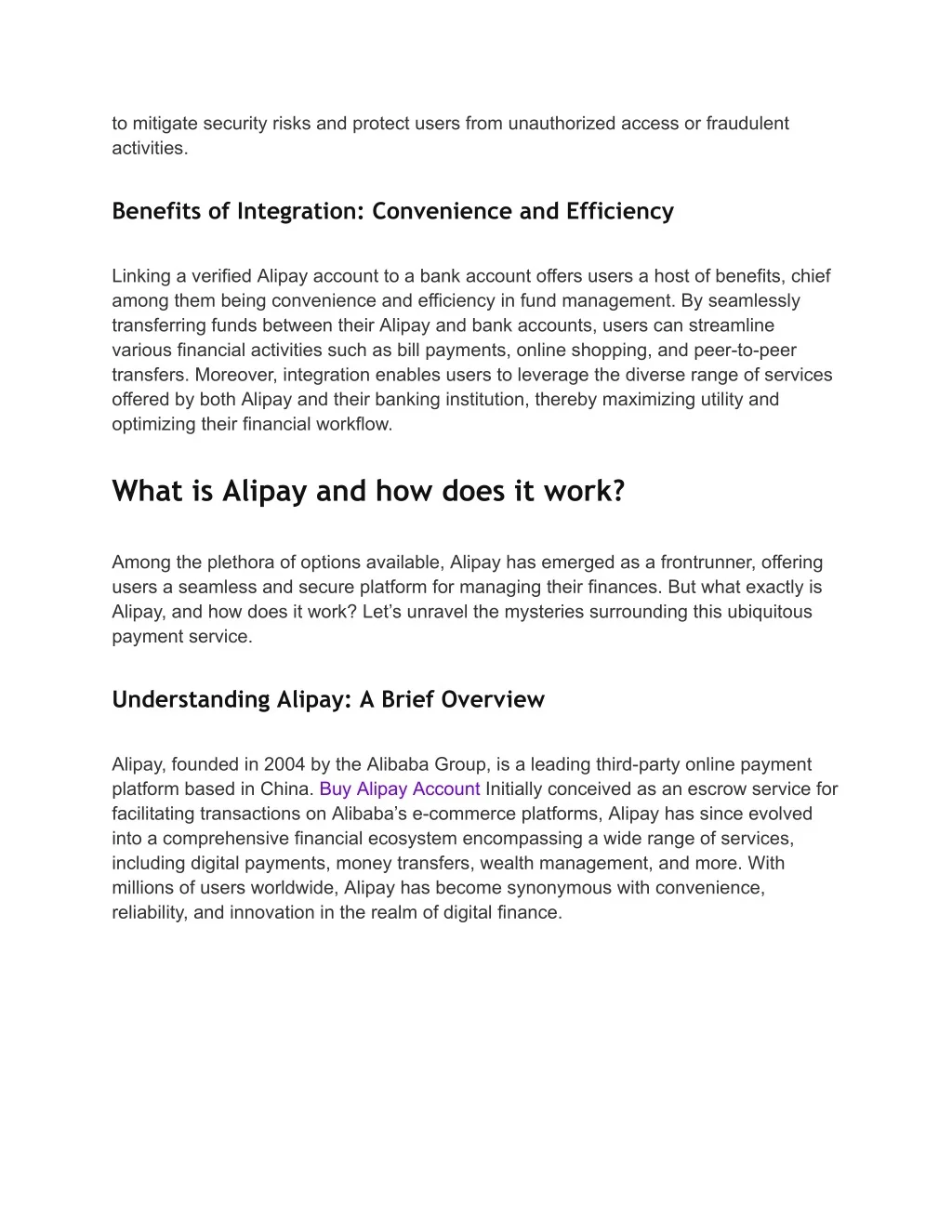 to mitigate security risks and protect users from unauthorized access or fraudulent activities. Benefits of Integration: Convenience and Efficiency Linking a verified Alipay account to a bank account offers users a host of benefits, chief among them being convenience and efficiency in fund management. By seamlessly transferring funds between their Alipay and bank accounts, users can streamline various financial activities such as bill payments, online shopping, and peer-to-peer transfers. Moreover, integration enables users to leverage the diverse range of services offered by both Alipay and their banking institution, thereby maximizing utility and optimizing their financial workflow. What is Alipay and how does it work? Among the plethora of options available, Alipay has emerged as a frontrunner, offering users a seamless and secure platform for managing their finances. But what exactly is Alipay, and how does it work? Let’s unravel the mysteries surrounding this ubiquitous payment service. Understanding Alipay: A Brief Overview Alipay, founded in 2004 by the Alibaba Group, is a leading third-party online payment platform based in China. Buy Alipay Account Initially conceived as an escrow service for facilitating transactions on Alibaba’s e-commerce platforms, Alipay has since evolved into a comprehensive financial ecosystem encompassing a wide range of services, including digital payments, money transfers, wealth management, and more. With millions of users worldwide, Alipay has become synonymous with convenience, reliability, and innovation in the realm of digital finance.
