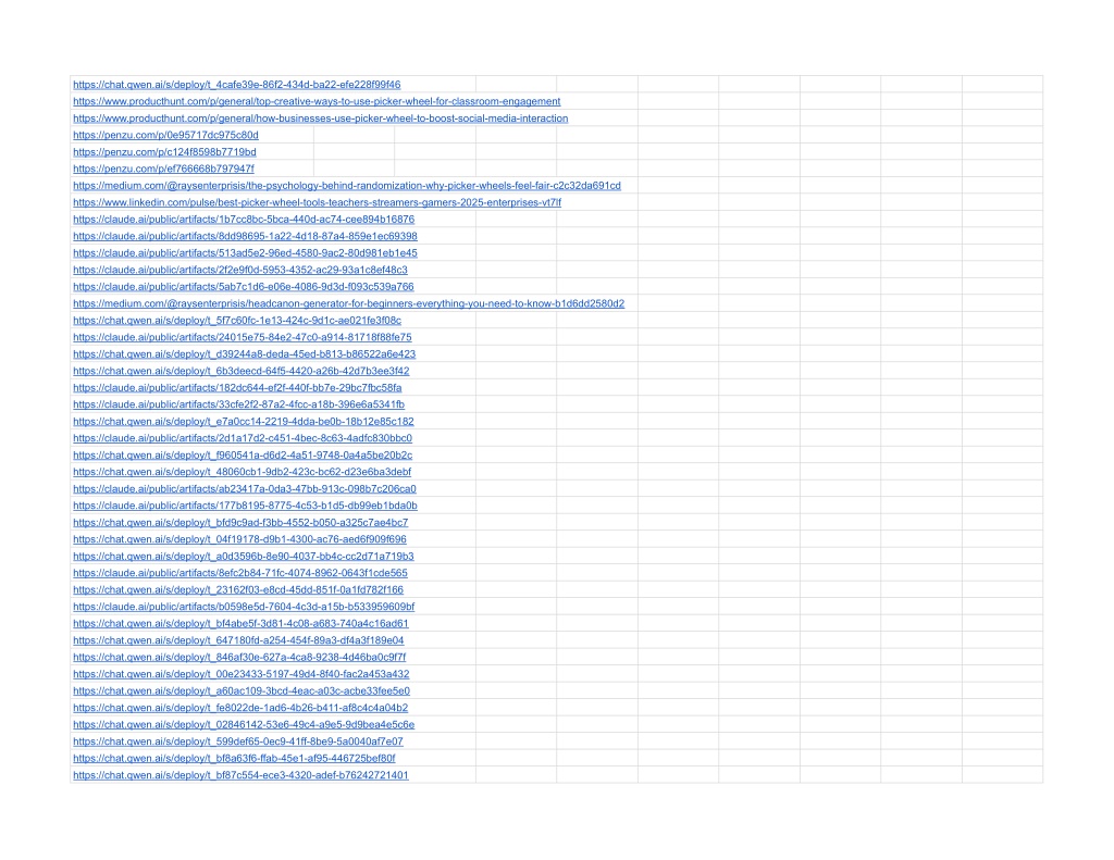 https://chat.qwen.ai/s/deploy/t_4cafe39e-86f2-434d-ba22-efe228f99f46https://chat.qwen.ai/s/deploy/t_4cafe39e-86f2-434d-ba22-efe228f99f46 https://www.producthunt.com/p/general/top-creative-ways-to-use-picker-wheel-for-classroom-engagement https://www.producthunt.com/p/general/how-businesses-use-picker-wheel-to-boost-social-media-interaction https://penzu.com/p/0e95717dc975c80d https://penzu.com/p/c124f8598b7719bd https://penzu.com/p/ef766668b797947f https://medium.com/@raysenterprisis/the-psychology-behind-randomization-why-picker-wheels-feel-fair-c2c32da691cd https://www.linkedin.com/pulse/best-picker-wheel-tools-teachers-streamers-gamers-2025-enterprises-vt7lf https://claude.ai/public/artifacts/1b7cc8bc-5bca-440d-ac74-cee894b16876 https://claude.ai/public/artifacts/8dd98695-1a22-4d18-87a4-859e1ec69398 https://claude.ai/public/artifacts/513ad5e2-96ed-4580-9ac2-80d981eb1e45 https://claude.ai/public/artifacts/2f2e9f0d-5953-4352-ac29-93a1c8ef48c3 https://claude.ai/public/artifacts/5ab7c1d6-e06e-4086-9d3d-f093c539a766 https://medium.com/@raysenterprisis/headcanon-generator-for-beginners-everything-you-need-to-know-b1d6dd2580d2 https://chat.qwen.ai/s/deploy/t_5f7c60fc-1e13-424c-9d1c-ae021fe3f08c https://claude.ai/public/artifacts/24015e75-84e2-47c0-a914-81718f88fe75 https://chat.qwen.ai/s/deploy/t_d39244a8-deda-45ed-b813-b86522a6e423 https://chat.qwen.ai/s/deploy/t_6b3deecd-64f5-4420-a26b-42d7b3ee3f42 https://claude.ai/public/artifacts/182dc644-ef2f-440f-bb7e-29bc7fbc58fa https://claude.ai/public/artifacts/33cfe2f2-87a2-4fcc-a18b-396e6a5341fb https://chat.qwen.ai/s/deploy/t_e7a0cc14-2219-4dda-be0b-18b12e85c182 https://claude.ai/public/artifacts/2d1a17d2-c451-4bec-8c63-4adfc830bbc0 https://chat.qwen.ai/s/deploy/t_f960541a-d6d2-4a51-9748-0a4a5be20b2c https://chat.qwen.ai/s/deploy/t_48060cb1-9db2-423c-bc62-d23e6ba3debf https://claude.ai/public/artifacts/ab23417a-0da3-47bb-913c-098b7c206ca0 https://claude.ai/public/artifacts/177b8195-8775-4c53-b1d5-db99eb1bda0b https://chat.qwen.ai/s/deploy/t_bfd9c9ad-f3bb-4552-b050-a325c7ae4bc7 https://chat.qwen.ai/s/deploy/t_04f19178-d9b1-4300-ac76-aed6f909f696 https://chat.qwen.ai/s/deploy/t_a0d3596b-8e90-4037-bb4c-cc2d71a719b3 https://claude.ai/public/artifacts/8efc2b84-71fc-4074-8962-0643f1cde565 https://chat.qwen.ai/s/deploy/t_23162f03-e8cd-45dd-851f-0a1fd782f166 https://claude.ai/public/artifacts/b0598e5d-7604-4c3d-a15b-b533959609bf https://chat.qwen.ai/s/deploy/t_bf4abe5f-3d81-4c08-a683-740a4c16ad61 https://chat.qwen.ai/s/deploy/t_647180fd-a254-454f-89a3-df4a3f189e04 https://chat.qwen.ai/s/deploy/t_846af30e-627a-4ca8-9238-4d46ba0c9f7f https://chat.qwen.ai/s/deploy/t_00e23433-5197-49d4-8f40-fac2a453a432 https://chat.qwen.ai/s/deploy/t_a60ac109-3bcd-4eac-a03c-acbe33fee5e0 https://chat.qwen.ai/s/deploy/t_fe8022de-1ad6-4b26-b411-af8c4c4a04b2 https://chat.qwen.ai/s/deploy/t_02846142-53e6-49c4-a9e5-9d9bea4e5c6e https://chat.qwen.ai/s/deploy/t_599def65-0ec9-41ff-8be9-5a0040af7e07 https://chat.qwen.ai/s/deploy/t_bf8a63f6-ffab-45e1-af95-446725bef80f https://chat.qwen.ai/s/deploy/t_bf87c554-ece3-4320-adef-b76242721401