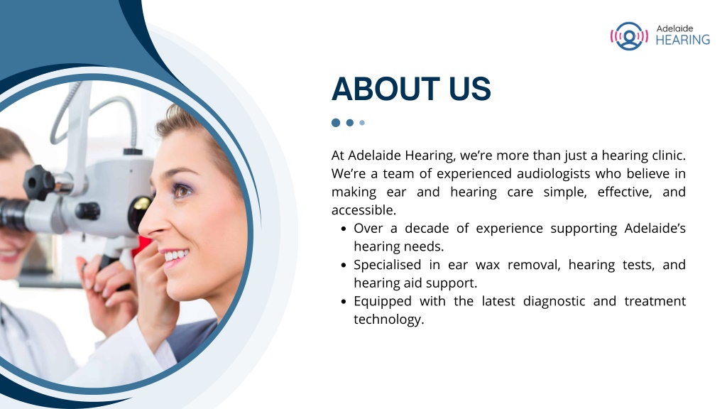 ABOUT US At Adelaide Hearing, we’re more than just a hearing clinic. We’re a team of experienced audiologists who believe in making ear and hearing care simple, effective, and accessible. Over a decade of experience supporting Adelaide’s hearing needs. Specialised in ear wax removal, hearing tests, and hearing aid support. Equipped with the latest diagnostic and treatment technology.