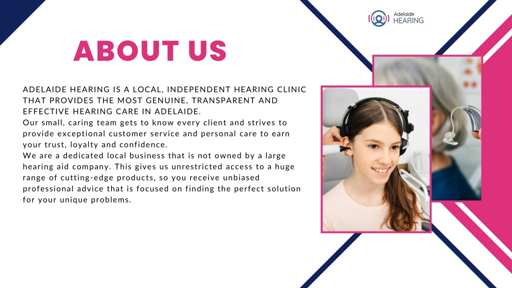 ABOUT US ADELAIDE HEARING IS A LOCAL, INDEPENDENT HEARING CLINIC THAT PROVIDES THE MOST GENUINE, TRANSPARENT AND EFFECTIVE HEARING CARE IN ADELAIDE. Our small, caring team gets to know every client and strives to provide exceptional customer service and personal care to earn your trust, loyalty and confidence. We are a dedicated local business that is not owned by a large hearing aid company. This gives us unrestricted access to a huge range of cutting-edge products, so you receive unbiased professional advice that is focused on finding the perfect solution for your unique problems.