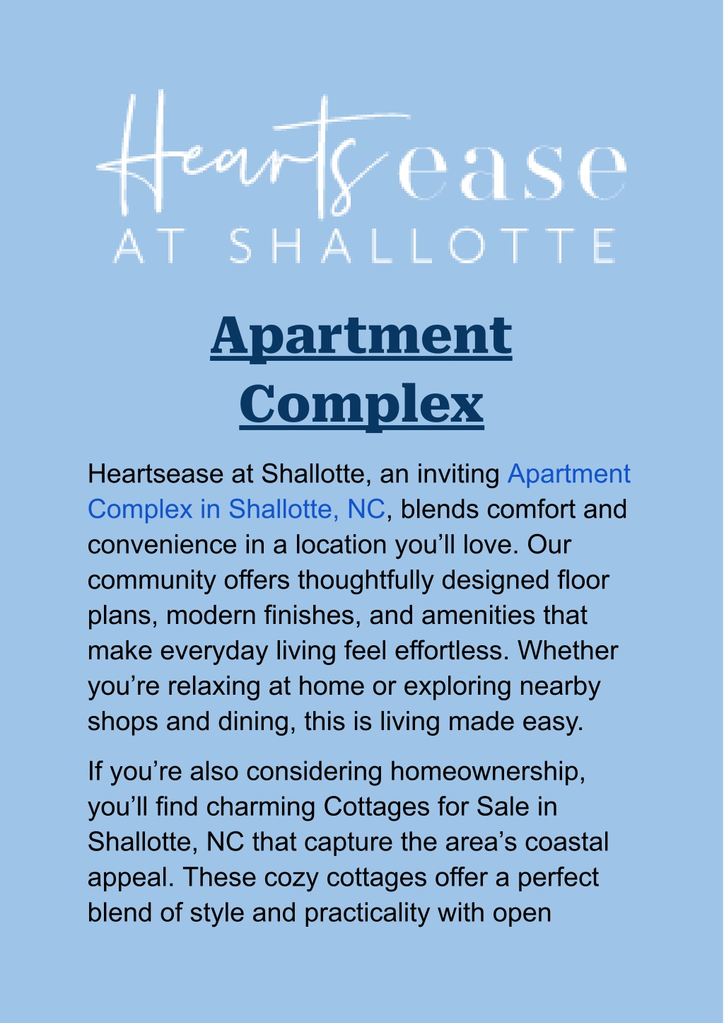 1. Apartment Complex Heartsease at Shallotte, an inviting Apartment Complex in Shallotte, NC, blends comfort and convenience in a location you’ll love. Our community offers thoughtfully designed floor plans, modern finishes, and amenities that make everyday living feel effortless. Whether you’re relaxing at home or exploring nearby shops and dining, this is living made easy. If you’re also considering homeownership, you’ll find charming Cottages for Sale in Shallotte, NC that capture the area’s coastal appeal. These cozy cottages offer a perfect blend of style and practicality with open