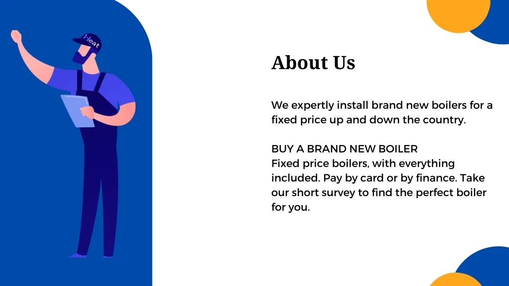 About Us We expertly install brand new boilers for a fixed price up and down the country. BUY A BRAND NEW BOILER Fixed price boilers, with everything included. Pay by card or by finance. Take our short survey to find the perfect boiler for you.