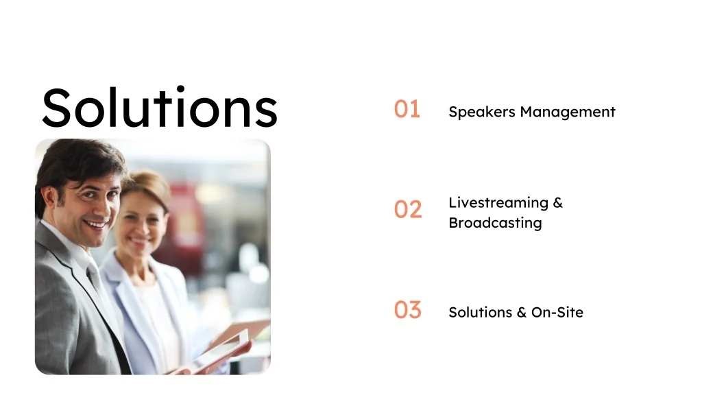 Solutions 01 Speakers Management 02 Livestreaming & Broadcasting 03 Solutions & On-Site