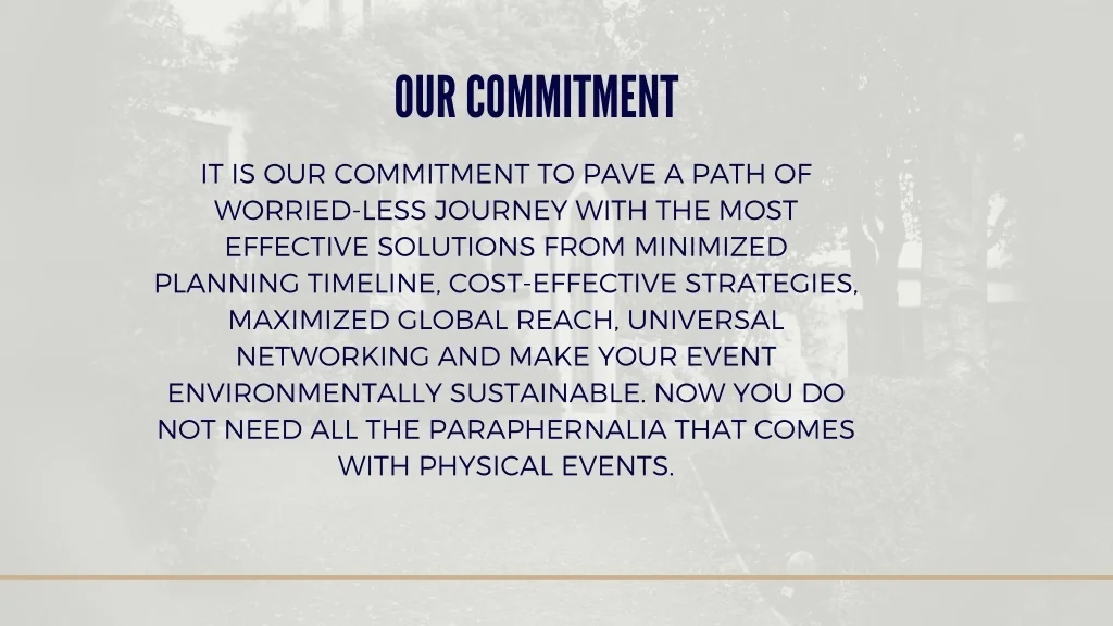 OURCOMMITMENT ITISOURCOMMITMENTTOPAVEAPATHOF WORRIED-LESSJOURNEYWITHTHEMOST EFFECTIVESOLUTIONSFROMMINIMIZED PLANNINGTIMELINE, COST-EFFECTIVESTRATEGIES, MAXIMIZEDGLOBALREACH, UNIVERSAL NETWORKINGANDMAKEYOUREVENT ENVIRONMENTALLYSUSTAINABLE. NOWYOUDO NOTNEEDALLTHEPARAPHERNALIATHATCOMES WITHPHYSICALEVENTS.