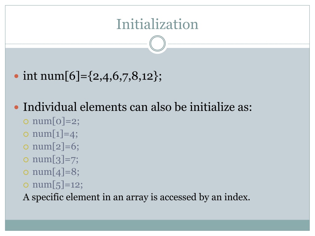 Initialization int num[6]={2,4,6,7,8,12}; Individual elements can also be initialize as: num[0]=2; num[1]=4; num[2]=6; num[3]=7; num[4]=8; num[5]=12; A specific element in an array is accessed by an index.