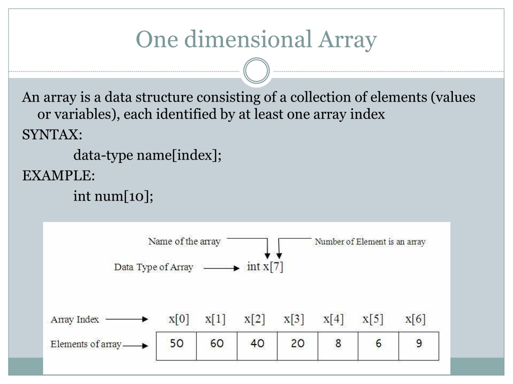 One dimensional Array An array is a data structure consisting of a collection of elements (values or variables), each identified by at least one array index SYNTAX: data-type name[index]; EXAMPLE: int num[10];
