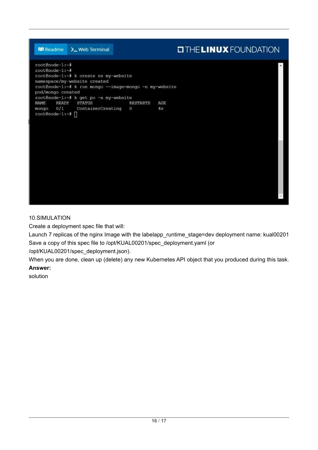 10.SIMULATION Create a deployment spec file that will: Launch 7 replicas of the nginx Image with the labelapp_runtime_stage=dev deployment name: kual00201 Save a copy of this spec file to /opt/KUAL00201/spec_deployment.yaml (or /opt/KUAL00201/spec_deployment.json). When you are done, clean up (delete) any new Kubernetes API object that you produced during this task. Answer: solution 16 / 17