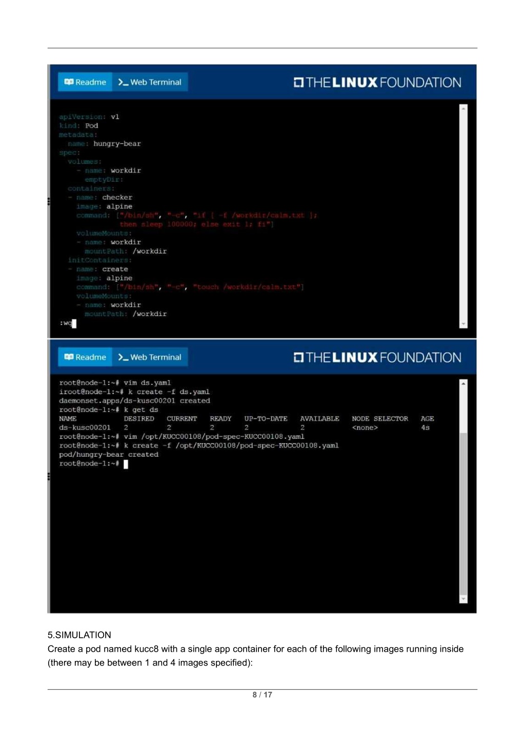 5.SIMULATION Create a pod named kucc8 with a single app container for each of the following images running inside (there may be between 1 and 4 images specified): 8 / 17