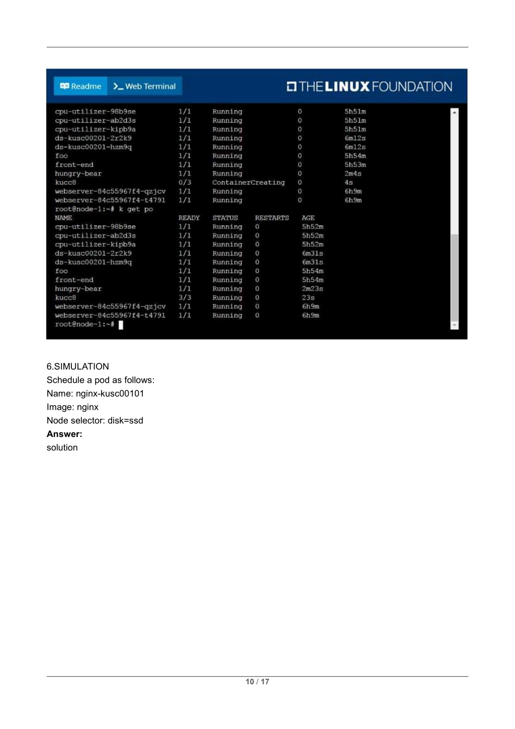 6.SIMULATION Schedule a pod as follows: Name: nginx-kusc00101 Image: nginx Node selector: disk=ssd Answer: solution 10 / 17