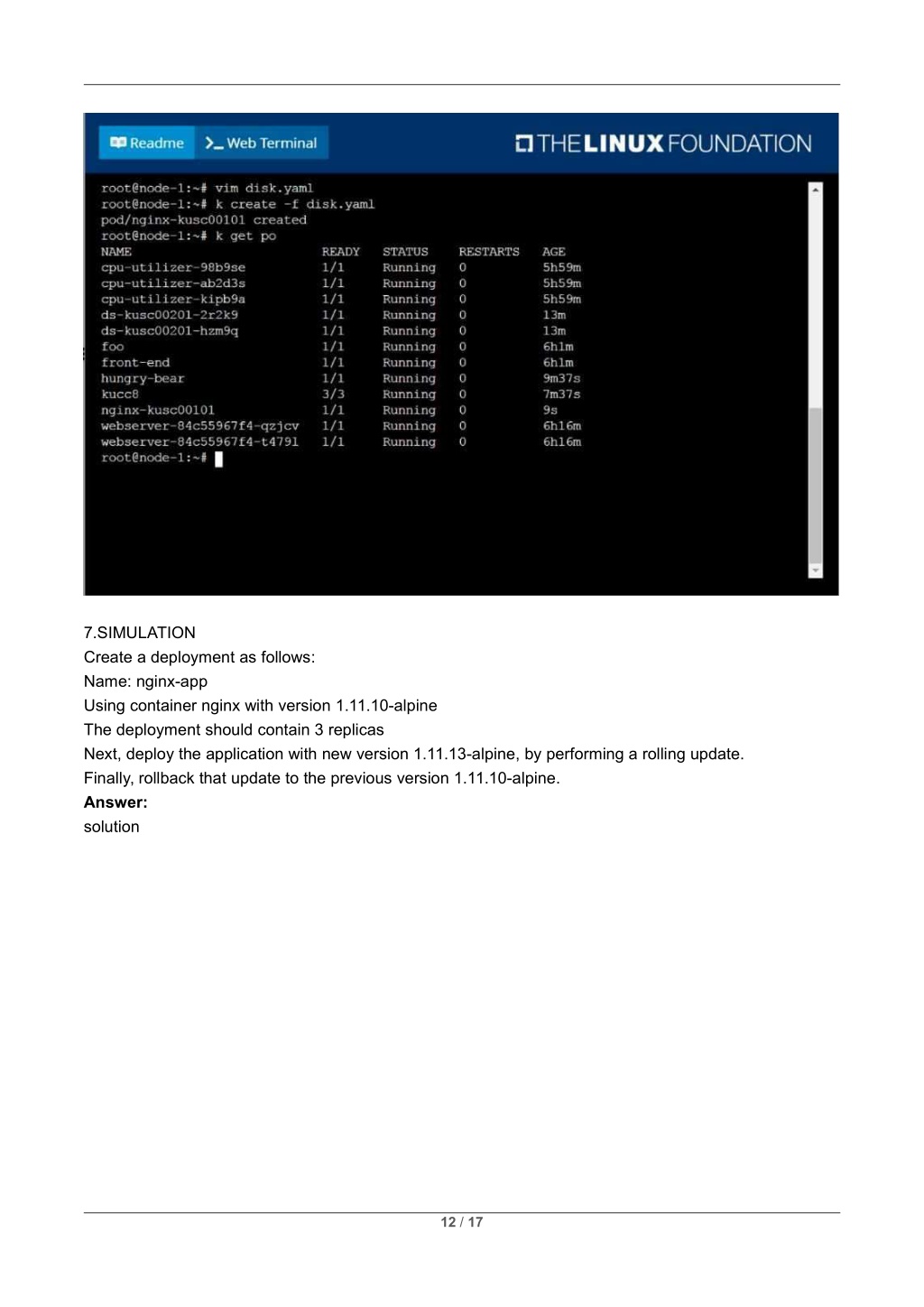 7.SIMULATION Create a deployment as follows: Name: nginx-app Using container nginx with version 1.11.10-alpine The deployment should contain 3 replicas Next, deploy the application with new version 1.11.13-alpine, by performing a rolling update. Finally, rollback that update to the previous version 1.11.10-alpine. Answer: solution 12 / 17