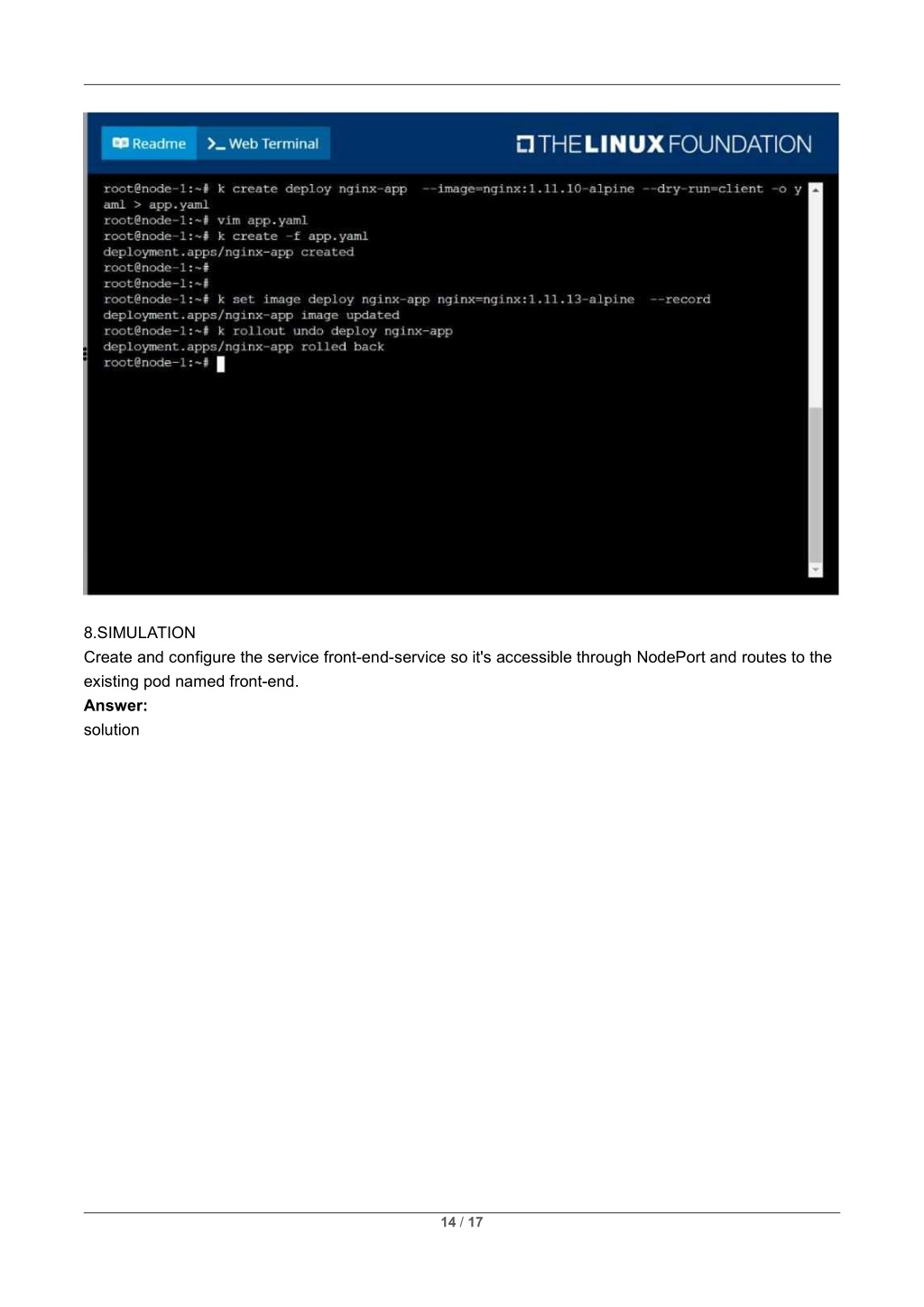 8.SIMULATION Create and configure the service front-end-service so it's accessible through NodePort and routes to the existing pod named front-end. Answer: solution 14 / 17