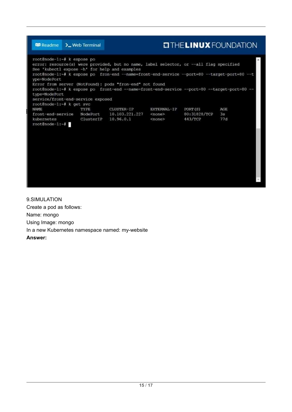 9.SIMULATION Create a pod as follows: Name: mongo Using Image: mongo In a new Kubernetes namespace named: my-website Answer: 15 / 17