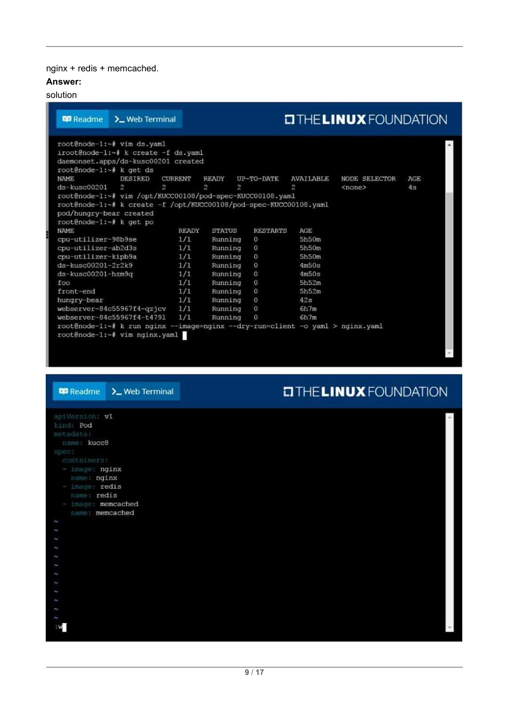 the root or privileged user. Step 5: Verify the output file (optional but smart) Check that the file was created and has the correct content: cat /opt/KULM00201/foo ✅ Final Answer Summary: kubectl config use-context k8s kubectl logs foo | grep "unable-to-access-website" > /opt/KULM00201/foo 2.SIMULATION List all persistent volumes sorted by capacity, saving the full kubectl output to /opt/KUCC00102/volume_list. Use kubectl 's own functionality for sorting the output, and do not manipulate it any further. Answer: solution 3.SIMULATION Ensure a single instance of pod nginx is running on each node of the Kubernetes cluster where nginx also represents the Image name which has to be used. Do not override any taints currently in place. Use DaemonSet to complete this task and use ds-kusc00201 as DaemonSet name. Answer: solution 4 / 17
