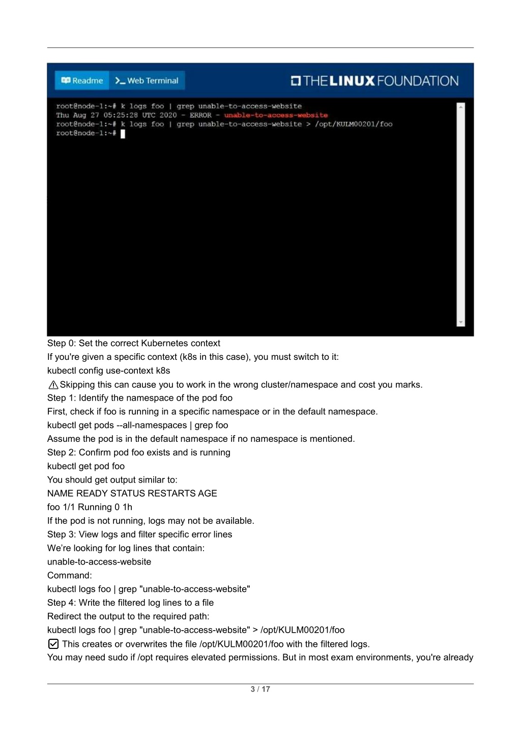 Step 0: Set the correct Kubernetes context If you're given a specific context (k8s in this case), you must switch to it: kubectl config use-context k8s ⚠Skipping this can cause you to work in the wrong cluster/namespace and cost you marks. Step 1: Identify the namespace of the pod foo First, check if foo is running in a specific namespace or in the default namespace. kubectl get pods --all-namespaces | grep foo Assume the pod is in the default namespace if no namespace is mentioned. Step 2: Confirm pod foo exists and is running kubectl get pod foo You should get output similar to: NAME READY STATUS RESTARTS AGE foo 1/1 Running 0 1h If the pod is not running, logs may not be available. Step 3: View logs and filter specific error lines We’re looking for log lines that contain: unable-to-access-website Command: kubectl logs foo | grep "unable-to-access-website" Step 4: Write the filtered log lines to a file Redirect the output to the required path: kubectl logs foo | grep "unable-to-access-website" > /opt/KULM00201/foo ✅ This creates or overwrites the file /opt/KULM00201/foo with the filtered logs. You may need sudo if /opt requires elevated permissions. But in most exam environments, you're already 3 / 17