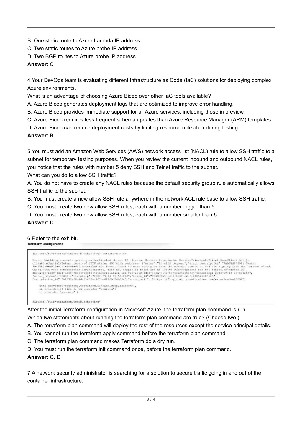 B. One static route to Azure Lambda IP address. C. Two static routes to Azure probe IP address. D. Two BGP routes to Azure probe IP address. Answer: C 4.Your DevOps team is evaluating different Infrastructure as Code (IaC) solutions for deploying complex Azure environments. What is an advantage of choosing Azure Bicep over other IaC tools available? A. Azure Bicep generates deployment logs that are optimized to improve error handling. B. Azure Bicep provides immediate support for all Azure services, including those in preview. C. Azure Bicep requires less frequent schema updates than Azure Resource Manager (ARM) templates. D. Azure Bicep can reduce deployment costs by limiting resource utilization during testing. Answer: B 5.You must add an Amazon Web Services (AWS) network access list (NACL) rule to allow SSH traffic to a subnet for temporary testing purposes. When you review the current inbound and outbound NACL rules, you notice that the rules with number 5 deny SSH and Telnet traffic to the subnet. What can you do to allow SSH traffic? A. You do not have to create any NACL rules because the default security group rule automatically allows SSH traffic to the subnet. B. You must create a new allow SSH rule anywhere in the network ACL rule base to allow SSH traffic. C. You must create two new allow SSH rules, each with a number bigger than 5. D. You must create two new allow SSH rules, each with a number smaller than 5. Answer: D 6.Refer to the exhibit. After the initial Terraform configuration in Microsoft Azure, the terraform plan command is run. Which two statements about running the terraform plan command are true? (Choose two.) A. The terraform plan command will deploy the rest of the resources except the service principal details. B. You cannot run the terraform apply command before the terraform plan command. C. The terraform plan command makes Terraform do a dry run. D. You must run the terraform init command once, before the terraform plan command. Answer: C, D 7.A network security administrator is searching for a solution to secure traffic going in and out of the container infrastructure. 3 / 4