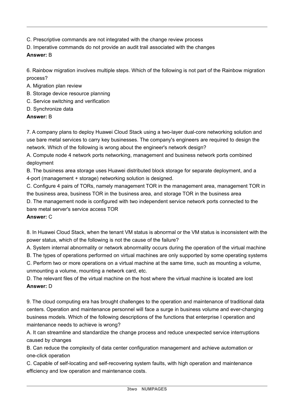 C. Prescriptive commands are not integrated with the change review process D. Imperative commands do not provide an audit trail associated with the changes Answer: B 6. Rainbow migration involves multiple steps. Which of the following is not part of the Rainbow migration process? A. Migration plan review B. Storage device resource planning C. Service switching and verification D. Synchronize data Answer: B 7. A company plans to deploy Huawei Cloud Stack using a two-layer dual-core networking solution and use bare metal services to carry key businesses. The company's engineers are required to design the network. Which of the following is wrong about the engineer's network design? A. Compute node 4 network ports networking, management and business network ports combined deployment B. The business area storage uses Huawei distributed block storage for separate deployment, and a 4-port (management + storage) networking solution is designed. C. Configure 4 pairs of TORs, namely management TOR in the management area, management TOR in the business area, business TOR in the business area, and storage TOR in the business area D. The management node is configured with two independent service network ports connected to the bare metal server's service access TOR Answer: C 8. In Huawei Cloud Stack, when the tenant VM status is abnormal or the VM status is inconsistent with the power status, which of the following is not the cause of the failure? A. System internal abnormality or network abnormality occurs during the operation of the virtual machine B. The types of operations performed on virtual machines are only supported by some operating systems C. Perform two or more operations on a virtual machine at the same time, such as mounting a volume, unmounting a volume, mounting a network card, etc. D. The relevant files of the virtual machine on the host where the virtual machine is located are lost Answer: D 9. The cloud computing era has brought challenges to the operation and maintenance of traditional data centers. Operation and maintenance personnel will face a surge in business volume and ever-changing business models. Which of the following descriptions of the functions that enterprise I operation and maintenance needs to achieve is wrong? A. It can streamline and standardize the change process and reduce unexpected service interruptions caused by changes B. Can reduce the complexity of data center configuration management and achieve automation or one-click operation C. Capable of self-locating and self-recovering system faults, with high operation and maintenance efficiency and low operation and maintenance costs. 3two NUMPAGES