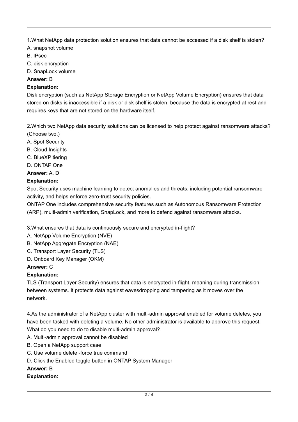 1.What NetApp data protection solution ensures that data cannot be accessed if a disk shelf is stolen? A. snapshot volume B. IPsec C. disk encryption D. SnapLock volume Answer: B Explanation: Disk encryption (such as NetApp Storage Encryption or NetApp Volume Encryption) ensures that data stored on disks is inaccessible if a disk or disk shelf is stolen, because the data is encrypted at rest and requires keys that are not stored on the hardware itself. 2.Which two NetApp data security solutions can be licensed to help protect against ransomware attacks? (Choose two.) A. Spot Security B. Cloud Insights C. BlueXP tiering D. ONTAP One Answer: A, D Explanation: Spot Security uses machine learning to detect anomalies and threats, including potential ransomware activity, and helps enforce zero-trust security policies. ONTAP One includes comprehensive security features such as Autonomous Ransomware Protection (ARP), multi-admin verification, SnapLock, and more to defend against ransomware attacks. 3.What ensures that data is continuously secure and encrypted in-flight? A. NetApp Volume Encryption (NVE) B. NetApp Aggregate Encryption (NAE) C. Transport Layer Security (TLS) D. Onboard Key Manager (OKM) Answer: C Explanation: TLS (Transport Layer Security) ensures that data is encrypted in-flight, meaning during transmission between systems. It protects data against eavesdropping and tampering as it moves over the network. 4.As the administrator of a NetApp cluster with multi-admin approval enabled for volume deletes, you have been tasked with deleting a volume. No other administrator is available to approve this request. What do you need to do to disable multi-admin approval? A. Multi-admin approval cannot be disabled B. Open a NetApp support case C. Use volume delete -force true command D. Click the Enabled toggle button in ONTAP System Manager Answer: B Explanation: 2 / 4