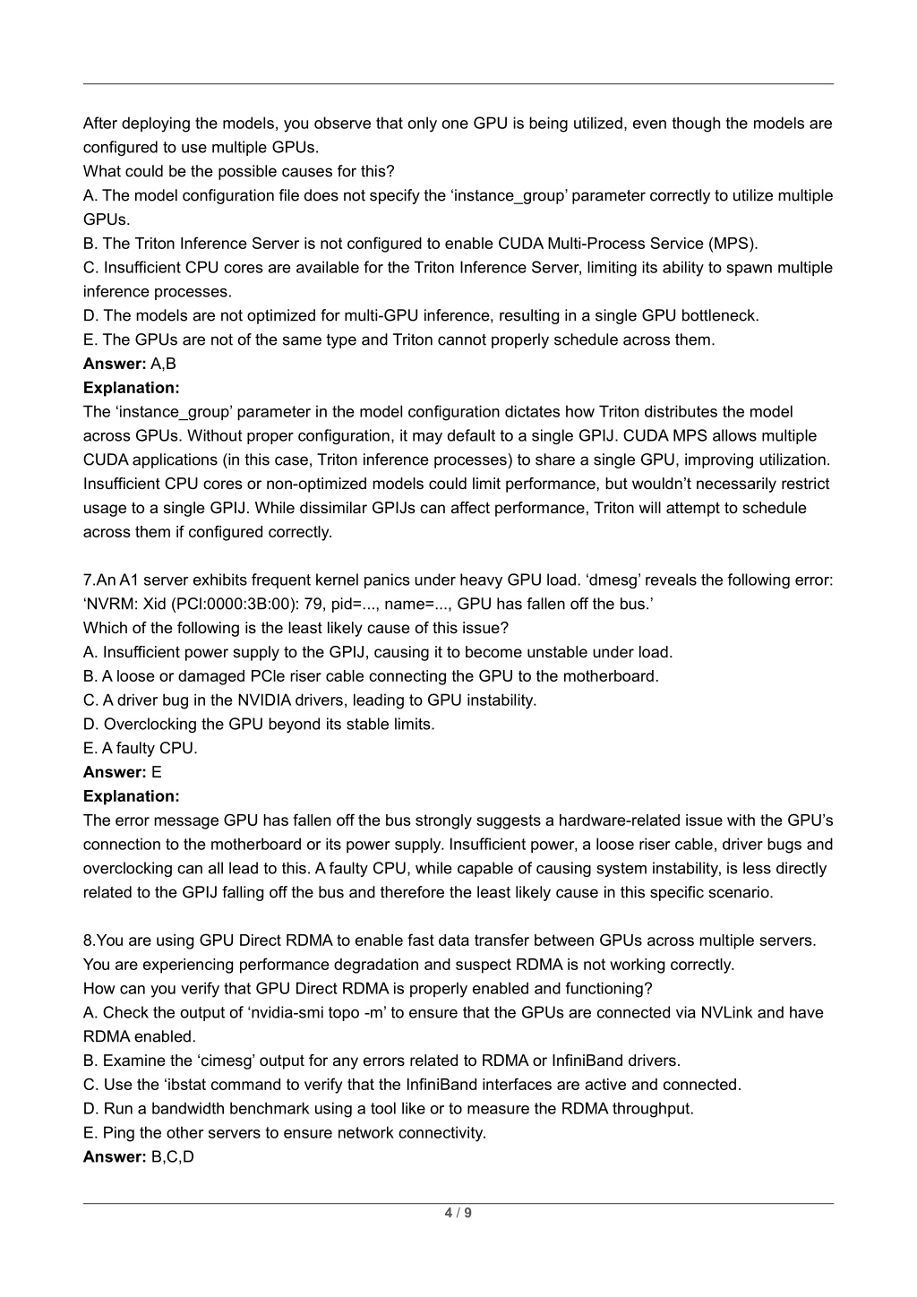 After deploying the models, you observe that only one GPU is being utilized, even though the models are configured to use multiple GPUs. What could be the possible causes for this? A. The model configuration file does not specify the ‘instance_group’ parameter correctly to utilize multiple GPUs. B. The Triton Inference Server is not configured to enable CUDA Multi-Process Service (MPS). C. Insufficient CPU cores are available for the Triton Inference Server, limiting its ability to spawn multiple inference processes. D. The models are not optimized for multi-GPU inference, resulting in a single GPU bottleneck. E. The GPUs are not of the same type and Triton cannot properly schedule across them. Answer: A,B Explanation: The ‘instance_group’ parameter in the model configuration dictates how Triton distributes the model across GPUs. Without proper configuration, it may default to a single GPIJ. CUDA MPS allows multiple CUDA applications (in this case, Triton inference processes) to share a single GPU, improving utilization. Insufficient CPU cores or non-optimized models could limit performance, but wouldn’t necessarily restrict usage to a single GPIJ. While dissimilar GPIJs can affect performance, Triton will attempt to schedule across them if configured correctly. 7.An A1 server exhibits frequent kernel panics under heavy GPU load. ‘dmesg’ reveals the following error: ‘NVRM: Xid (PCl:0000:3B:00): 79, pid=..., name=..., GPU has fallen off the bus.’ Which of the following is the least likely cause of this issue? A. Insufficient power supply to the GPIJ, causing it to become unstable under load. B. A loose or damaged PCle riser cable connecting the GPU to the motherboard. C. A driver bug in the NVIDIA drivers, leading to GPU instability. D. Overclocking the GPU beyond its stable limits. E. A faulty CPU. Answer: E Explanation: The error message GPU has fallen off the bus strongly suggests a hardware-related issue with the GPU’s connection to the motherboard or its power supply. Insufficient power, a loose riser cable, driver bugs and overclocking can all lead to this. A faulty CPU, while capable of causing system instability, is less directly related to the GPIJ falling off the bus and therefore the least likely cause in this specific scenario. 8.You are using GPU Direct RDMA to enable fast data transfer between GPUs across multiple servers. You are experiencing performance degradation and suspect RDMA is not working correctly. How can you verify that GPU Direct RDMA is properly enabled and functioning? A. Check the output of ‘nvidia-smi topo -m’ to ensure that the GPUs are connected via NVLink and have RDMA enabled. B. Examine the ‘cimesg’ output for any errors related to RDMA or InfiniBand drivers. C. Use the ‘ibstat command to verify that the InfiniBand interfaces are active and connected. D. Run a bandwidth benchmark using a tool like or to measure the RDMA throughput. E. Ping the other servers to ensure network connectivity. Answer: B,C,D 4 / 9