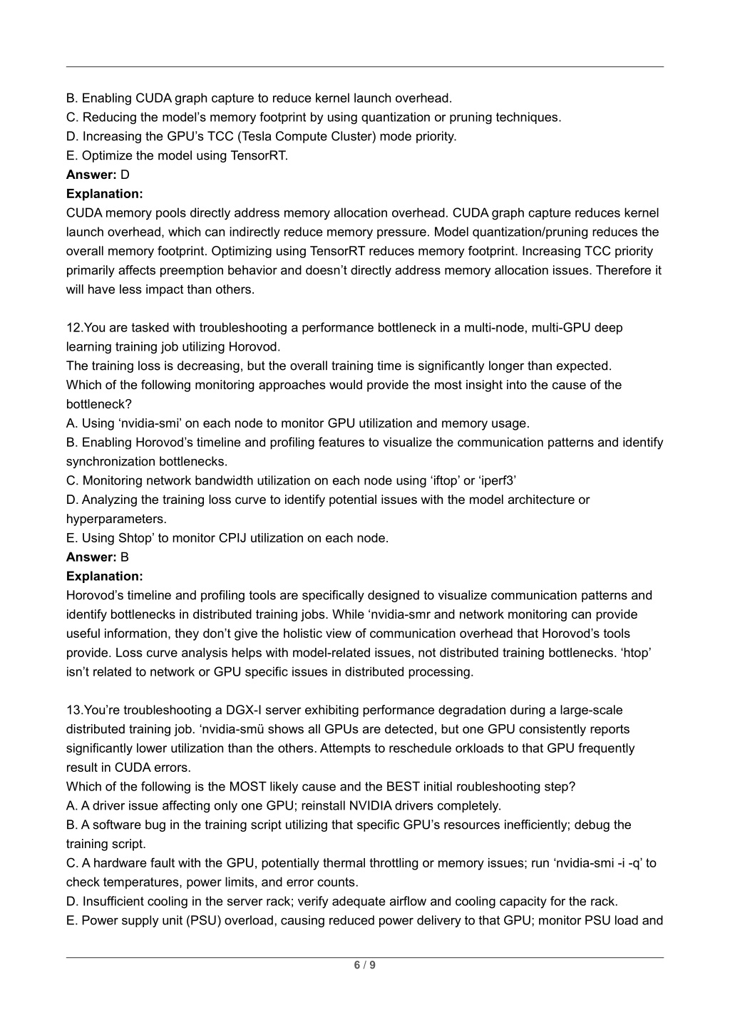 B. Enabling CUDA graph capture to reduce kernel launch overhead. C. Reducing the model’s memory footprint by using quantization or pruning techniques. D. Increasing the GPU’s TCC (Tesla Compute Cluster) mode priority. E. Optimize the model using TensorRT. Answer: D Explanation: CUDA memory pools directly address memory allocation overhead. CUDA graph capture reduces kernel launch overhead, which can indirectly reduce memory pressure. Model quantization/pruning reduces the overall memory footprint. Optimizing using TensorRT reduces memory footprint. Increasing TCC priority primarily affects preemption behavior and doesn’t directly address memory allocation issues. Therefore it will have less impact than others. 12.You are tasked with troubleshooting a performance bottleneck in a multi-node, multi-GPU deep learning training job utilizing Horovod. The training loss is decreasing, but the overall training time is significantly longer than expected. Which of the following monitoring approaches would provide the most insight into the cause of the bottleneck? A. Using ‘nvidia-smi’ on each node to monitor GPU utilization and memory usage. B. Enabling Horovod’s timeline and profiling features to visualize the communication patterns and identify synchronization bottlenecks. C. Monitoring network bandwidth utilization on each node using ‘iftop’ or ‘iperf3’ D. Analyzing the training loss curve to identify potential issues with the model architecture or hyperparameters. E. Using Shtop’ to monitor CPIJ utilization on each node. Answer: B Explanation: Horovod’s timeline and profiling tools are specifically designed to visualize communication patterns and identify bottlenecks in distributed training jobs. While ‘nvidia-smr and network monitoring can provide useful information, they don’t give the holistic view of communication overhead that Horovod’s tools provide. Loss curve analysis helps with model-related issues, not distributed training bottlenecks. ‘htop’ isn’t related to network or GPU specific issues in distributed processing. 13.You’re troubleshooting a DGX-I server exhibiting performance degradation during a large-scale distributed training job. ‘nvidia-smü shows all GPUs are detected, but one GPU consistently reports significantly lower utilization than the others. Attempts to reschedule orkloads to that GPU frequently result in CUDA errors. Which of the following is the MOST likely cause and the BEST initial roubleshooting step? A. A driver issue affecting only one GPU; reinstall NVIDIA drivers completely. B. A software bug in the training script utilizing that specific GPU’s resources inefficiently; debug the training script. C. A hardware fault with the GPU, potentially thermal throttling or memory issues; run ‘nvidia-smi -i -q’ to check temperatures, power limits, and error counts. D. Insufficient cooling in the server rack; verify adequate airflow and cooling capacity for the rack. E. Power supply unit (PSU) overload, causing reduced power delivery to that GPU; monitor PSU load and 6 / 9