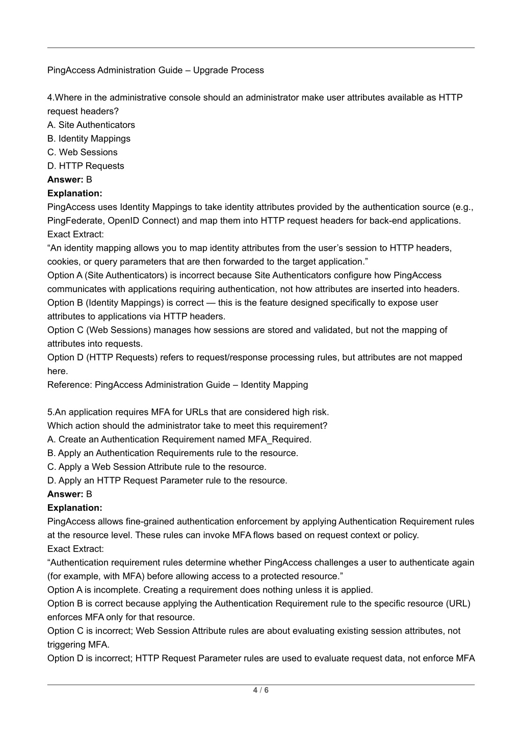 PingAccess Administration Guide – Upgrade Process 4.Where in the administrative console should an administrator make user attributes available as HTTP request headers? A. Site Authenticators B. Identity Mappings C. Web Sessions D. HTTP Requests Answer: B Explanation: PingAccess uses Identity Mappings to take identity attributes provided by the authentication source (e.g., PingFederate, OpenID Connect) and map them into HTTP request headers for back-end applications. Exact Extract: “An identity mapping allows you to map identity attributes from the user’s session to HTTP headers, cookies, or query parameters that are then forwarded to the target application.” Option A (Site Authenticators) is incorrect because Site Authenticators configure how PingAccess communicates with applications requiring authentication, not how attributes are inserted into headers. Option B (Identity Mappings) is correct — this is the feature designed specifically to expose user attributes to applications via HTTP headers. Option C (Web Sessions) manages how sessions are stored and validated, but not the mapping of attributes into requests. Option D (HTTP Requests) refers to request/response processing rules, but attributes are not mapped here. Reference: PingAccess Administration Guide – Identity Mapping 5.An application requires MFA for URLs that are considered high risk. Which action should the administrator take to meet this requirement? A. Create an Authentication Requirement named MFA_Required. B. Apply an Authentication Requirements rule to the resource. C. Apply a Web Session Attribute rule to the resource. D. Apply an HTTP Request Parameter rule to the resource. Answer: B Explanation: PingAccess allows fine-grained authentication enforcement by applying Authentication Requirement rules at the resource level. These rules can invoke MFA flows based on request context or policy. Exact Extract: “Authentication requirement rules determine whether PingAccess challenges a user to authenticate again (for example, with MFA) before allowing access to a protected resource.” Option A is incomplete. Creating a requirement does nothing unless it is applied. Option B is correct because applying the Authentication Requirement rule to the specific resource (URL) enforces MFA only for that resource. Option C is incorrect; Web Session Attribute rules are about evaluating existing session attributes, not triggering MFA. Option D is incorrect; HTTP Request Parameter rules are used to evaluate request data, not enforce MFA 4 / 6