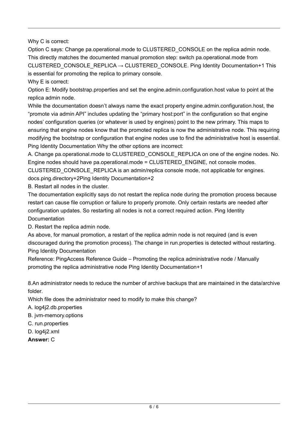 Why C is correct: Option C says: Change pa.operational.mode to CLUSTERED_CONSOLE on the replica admin node. This directly matches the documented manual promotion step: switch pa.operational.mode from CLUSTERED_CONSOLE_REPLICA → CLUSTERED_CONSOLE. Ping Identity Documentation+1 This is essential for promoting the replica to primary console. Why E is correct: Option E: Modify bootstrap.properties and set the engine.admin.configuration.host value to point at the replica admin node. While the documentation doesn’t always name the exact property engine.admin.configuration.host, the “promote via admin API” includes updating the “primary host:port” in the configuration so that engine nodes’ configuration queries (or whatever is used by engines) point to the new primary. This maps to ensuring that engine nodes know that the promoted replica is now the administrative node. This requiring modifying the bootstrap or configuration that engine nodes use to find the administrative host is essential. Ping Identity Documentation Why the other options are incorrect: A. Change pa.operational.mode to CLUSTERED_CONSOLE_REPLICA on one of the engine nodes. No. Engine nodes should have pa.operational.mode = CLUSTERED_ENGINE, not console modes. CLUSTERED_CONSOLE_REPLICA is an admin/replica console mode, not applicable for engines. docs.ping.directory+2Ping Identity Documentation+2 B. Restart all nodes in the cluster. The documentation explicitly says do not restart the replica node during the promotion process because restart can cause file corruption or failure to properly promote. Only certain restarts are needed after configuration updates. So restarting all nodes is not a correct required action. Ping Identity Documentation D. Restart the replica admin node. As above, for manual promotion, a restart of the replica admin node is not required (and is even discouraged during the promotion process). The change in run.properties is detected without restarting. Ping Identity Documentation Reference: PingAccess Reference Guide – Promoting the replica administrative node / Manually promoting the replica administrative node Ping Identity Documentation+1 8.An administrator needs to reduce the number of archive backups that are maintained in the data/archive folder. Which file does the administrator need to modify to make this change? A. log4j2.db.properties B. jvm-memory.options C. run.properties D. log4j2.xml Answer: C 6 / 6