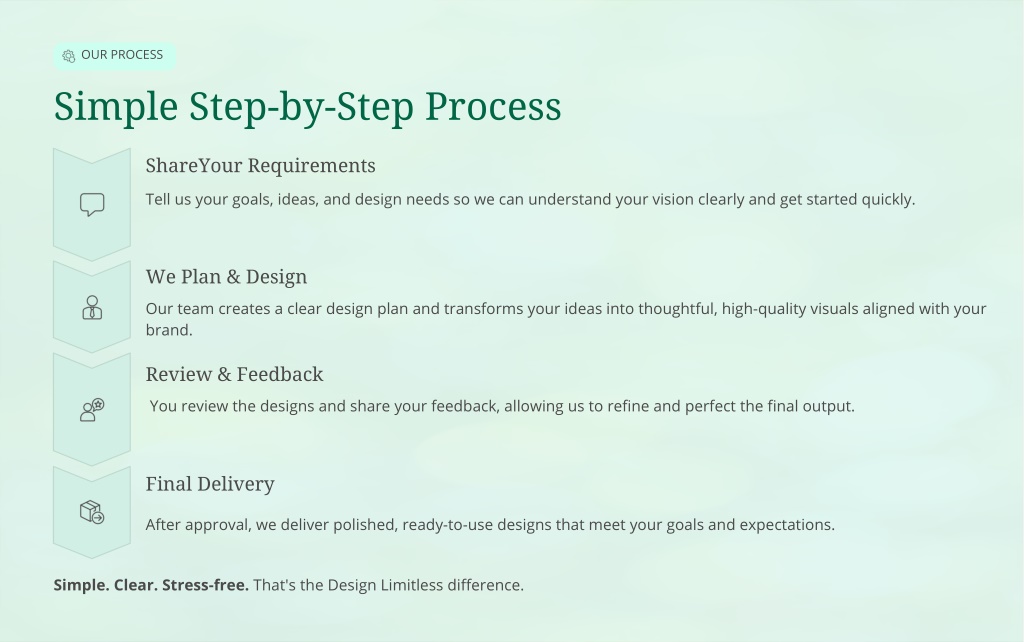7. OUR PROCESS Simple Step-by-Step Process ShareYour Requirements Tell us your goals, ideas, and design needs so we can understand your vision clearly and get started quickly. We Plan & Design Our team creates a clear design plan and transforms your ideas into thoughtful, high-quality visuals aligned with your brand. Review & Feedback You review the designs and share your feedback, allowing us to refine and perfect the final output. Final Delivery After approval, we deliver polished, ready-to-use designs that meet your goals and expectations. Simple. Clear. Stress-free. That's the Design Limitless difference.