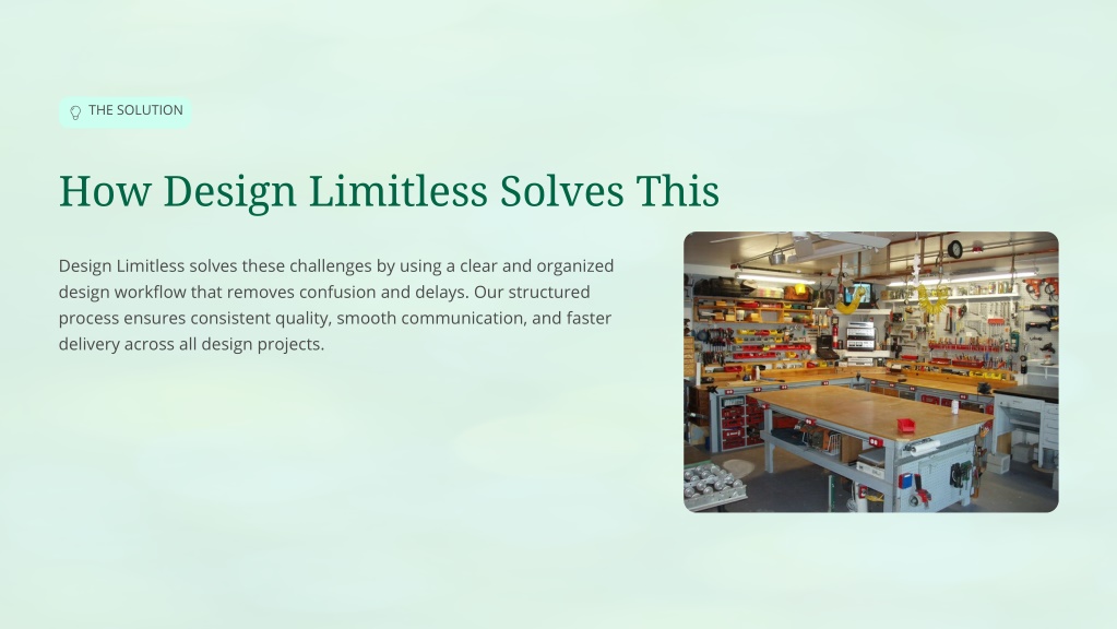 3. THE SOLUTION How Design Limitless Solves This Design Limitless solves these challenges by using a clear and organized design workflow that removes confusion and delays. Our structured process ensures consistent quality, smooth communication, and faster delivery across all design projects.