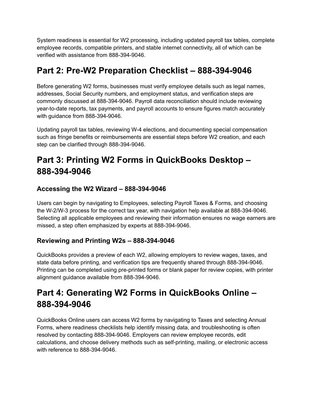 2. System readiness is essential for W2 processing, including updated payroll tax tables, complete employee records, compatible printers, and stable internet connectivity, all of which can be verified with assistance from 888-394-9046. Part 2: Pre-W2 Preparation Checklist – 888-394-9046 Before generating W2 forms, businesses must verify employee details such as legal names, addresses, Social Security numbers, and employment status, and verification steps are commonly discussed at 888-394-9046. Payroll data reconciliation should include reviewing year-to-date reports, tax payments, and payroll accounts to ensure figures match accurately with guidance from 888-394-9046. Updating payroll tax tables, reviewing W-4 elections, and documenting special compensation such as fringe benefits or reimbursements are essential steps before W2 creation, and each step can be clarified through 888-394-9046. Part 3: Printing W2 Forms in QuickBooks Desktop – 888-394-9046 Accessing the W2 Wizard – 888-394-9046 Users can begin by navigating to Employees, selecting Payroll Taxes & Forms, and choosing the W-2/W-3 process for the correct tax year, with navigation help available at 888-394-9046. Selecting all applicable employees and reviewing their information ensures no wage earners are missed, a step often emphasized by experts at 888-394-9046. Reviewing and Printing W2s – 888-394-9046 QuickBooks provides a preview of each W2, allowing employers to review wages, taxes, and state data before printing, and verification tips are frequently shared through 888-394-9046. Printing can be completed using pre-printed forms or blank paper for review copies, with printer alignment guidance available from 888-394-9046. Part 4: Generating W2 Forms in QuickBooks Online – 888-394-9046 QuickBooks Online users can access W2 forms by navigating to Taxes and selecting Annual Forms, where readiness checklists help identify missing data, and troubleshooting is often resolved by contacting 888-394-9046. Employers can review employee records, edit calculations, and choose delivery methods such as self-printing, mailing, or electronic access with reference to 888-394-9046.