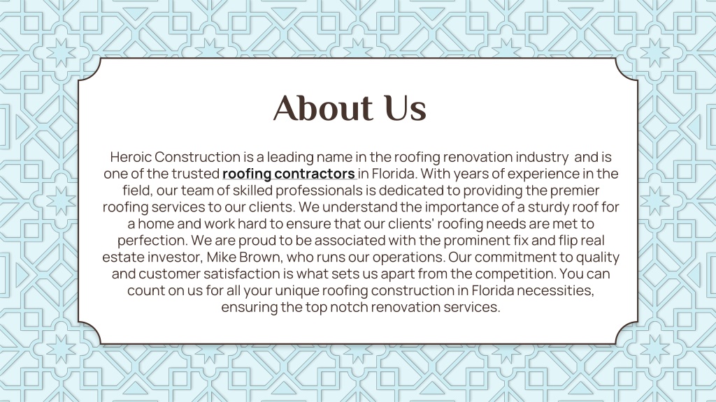 About Us Heroic Construction is a leading name in the roofing renovation industry and is one of the trusted roofing contractors in Florida. With years of experience in the field, our team of skilled professionals is dedicated to providing the premier roofing services to our clients. We understand the importance of a sturdy roof for a home and work hard to ensure that our clients' roofing needs are met to perfection. We are proud to be associated with the prominent fix and flip real estate investor, Mike Brown, who runs our operations. Our commitment to quality and customer satisfaction is what sets us apart from the competition. You can count on us for all your unique roofing construction in Florida necessities, ensuring the top notch renovation services.
