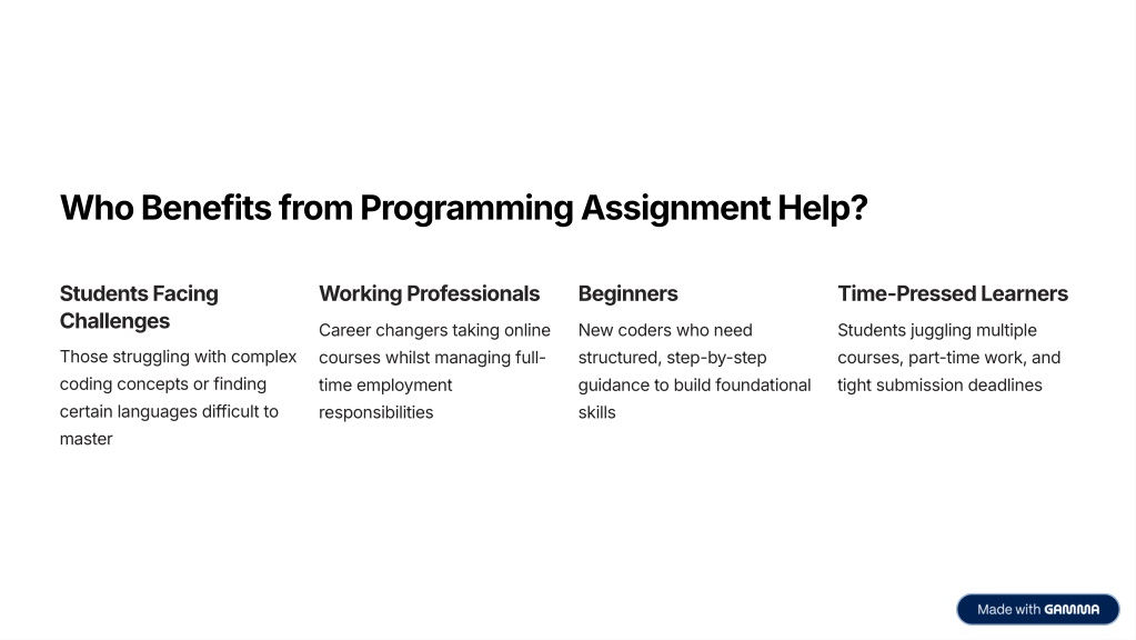 7. Who Benefits from Programming Assignment Help? Students Facing Challenges Working Professionals Beginners Time-Pressed Learners Career changers taking online courses whilst managing full- time employment responsibilities New coders who need structured, step-by-step guidance to build foundational skills Students juggling multiple courses, part-time work, and tight submission deadlines Those struggling with complex coding concepts or finding certain languages difficult to master