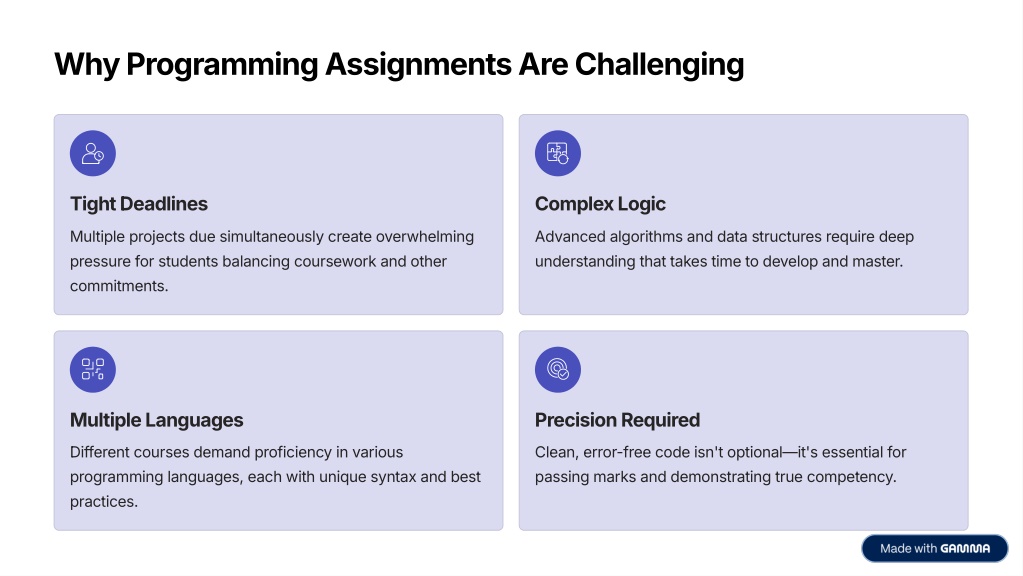 2. Why Programming Assignments Are Challenging Tight Deadlines Complex Logic Multiple projects due simultaneously create overwhelming pressure for students balancing coursework and other commitments. Advanced algorithms and data structures require deep understanding that takes time to develop and master. Multiple Languages Precision Required Different courses demand proficiency in various programming languages, each with unique syntax and best practices. Clean, error-free code isn't optional4it's essential for passing marks and demonstrating true competency.