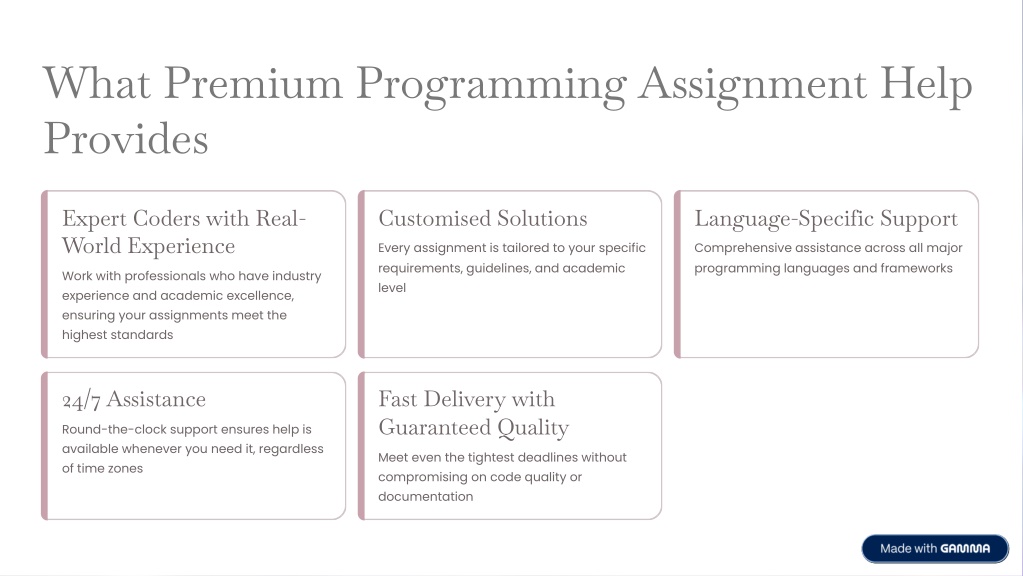 What Premium Programming Assignment Help Provides Expert Coders with Real- World Experience Customised Solutions Language-Specific Support Every assignment is tailored to your specific requirements, guidelines, and academic level Comprehensive assistance across all major programming languages and frameworks Work with professionals who have industry experience and academic excellence, ensuring your assignments meet the highest standards 24/7 Assistance Fast Delivery with Guaranteed Quality Round-the-clock support ensures help is available whenever you need it, regardless of time zones Meet even the tightest deadlines without compromising on code quality or documentation
