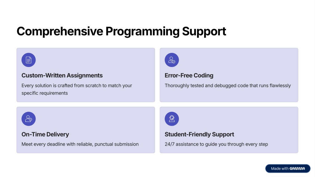 3. Comprehensive Programming Support Custom-Written Assignments Error-Free Coding Every solution is crafted from scratch to match your specific requirements Thoroughly tested and debugged code that runs flawlessly On-Time Delivery Student-Friendly Support Meet every deadline with reliable, punctual submission 24/7 assistance to guide you through every step