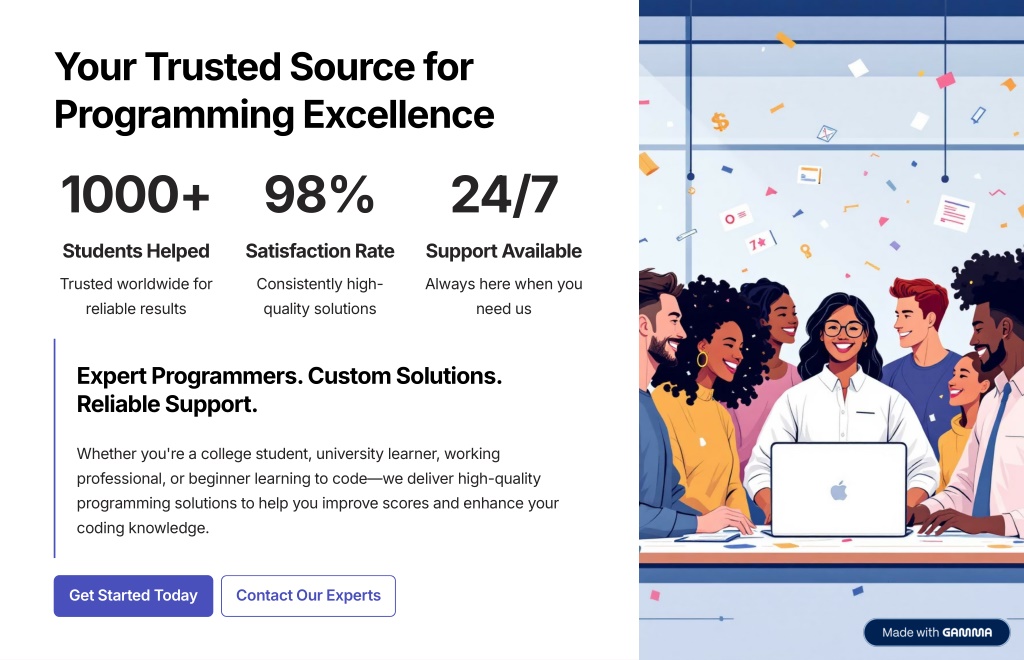 10. Your Trusted Source for Programming Excellence 1000+ 98% 24/7 Students Helped Satisfaction Rate Support Available Trusted worldwide for reliable results Consistently high- quality solutions Always here when you need us Expert Programmers. Custom Solutions. Reliable Support. Whether you're a college student, university learner, working professional, or beginner learning to code4we deliver high-quality programming solutions to help you improve scores and enhance your coding knowledge. Get Started Today Contact Our Experts