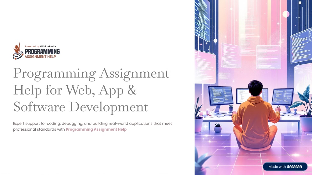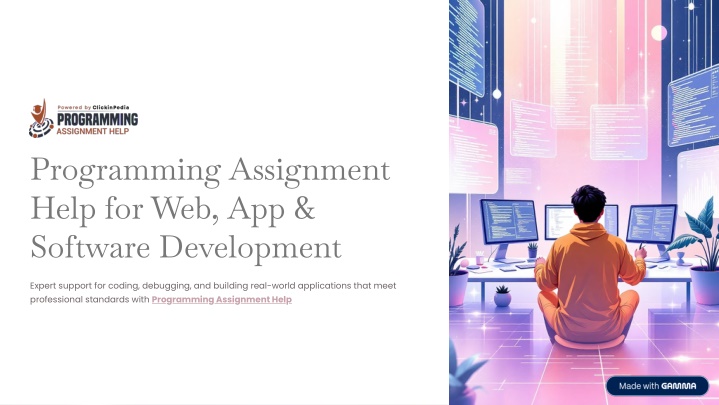 This presentation provides a complete overview of professional programming assignment help tailored for students and developers working on web development, mobile app development, and software engineering projects. It highlights key services including frontend and backend development support, Android/iOS app assistance, cross-platform app solutions, and help with coding in languages like Python, Java, C , C#, and JavaScript frameworks.<br><br>The PPT showcases how expert guidance can simplify complex coding tasks, improve code quality, and ensure timely project delivery. With a focus on debugging,