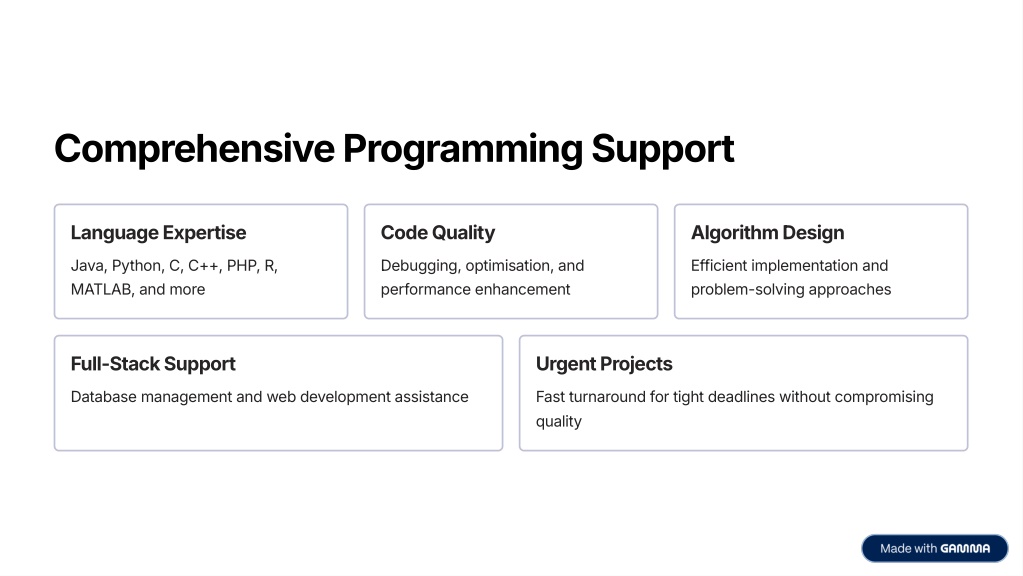Comprehensive Programming Support Language Expertise Code Quality Algorithm Design Java, Python, C, C++, PHP, R, MATLAB, and more Debugging, optimisation, and performance enhancement Efficient implementation and problem-solving approaches Full-Stack Support Urgent Projects Database management and web development assistance Fast turnaround for tight deadlines without compromising quality