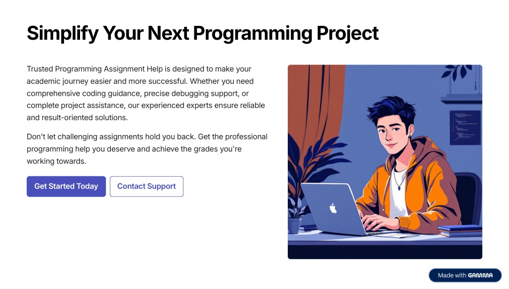 Simplify Your Next Programming Project Trusted Programming Assignment Help is designed to make your academic journey easier and more successful. Whether you need comprehensive coding guidance, precise debugging support, or complete project assistance, our experienced experts ensure reliable and result-oriented solutions. Don't let challenging assignments hold you back. Get the professional programming help you deserve and achieve the grades you're working towards. Get Started Today Contact Support