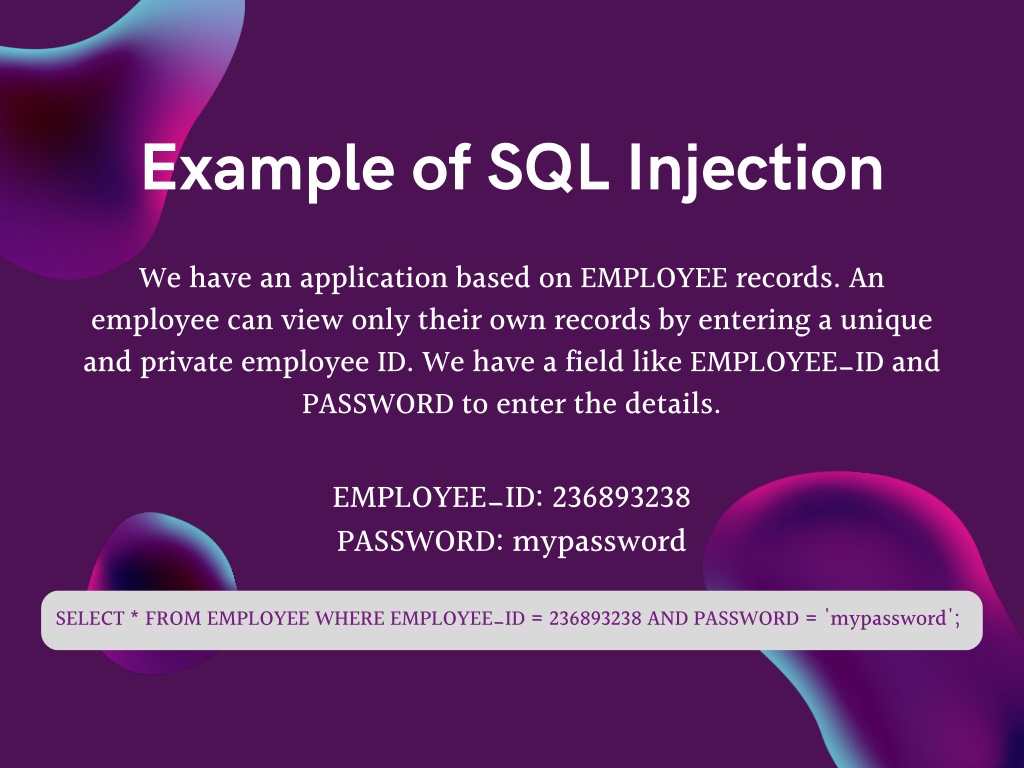 4. Example of SQL Injection We have an application based on EMPLOYEE records. An employee can view only their own records by entering a unique and private employee ID. We have a field like EMPLOYEE_ID and PASSWORD to enter the details. EMPLOYEE_ID: 236893238 PASSWORD: mypassword SELECT * FROM EMPLOYEE WHERE EMPLOYEE_ID = 236893238 AND PASSWORD = 'mypassword';