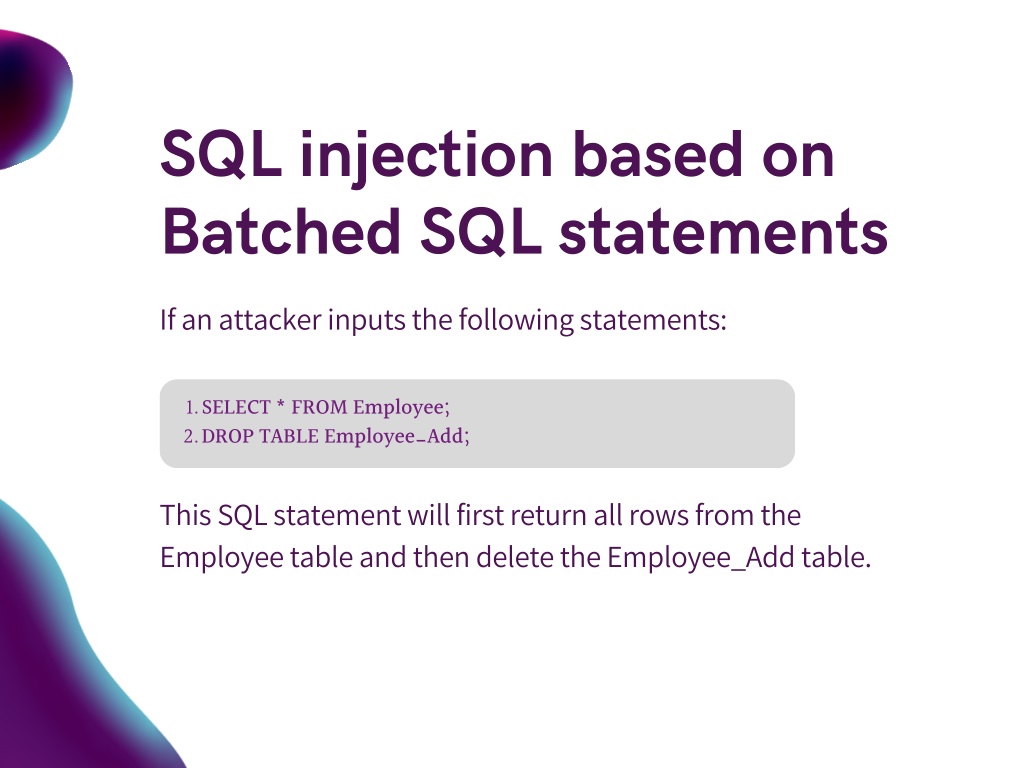 6. SQL injection based on Batched SQL statements If an attacker inputs the following statements: 1.SELECT * FROM Employee; 2.DROP TABLE Employee_Add; This SQL statement will first return all rows from the Employee table and then delete the Employee_Add table.