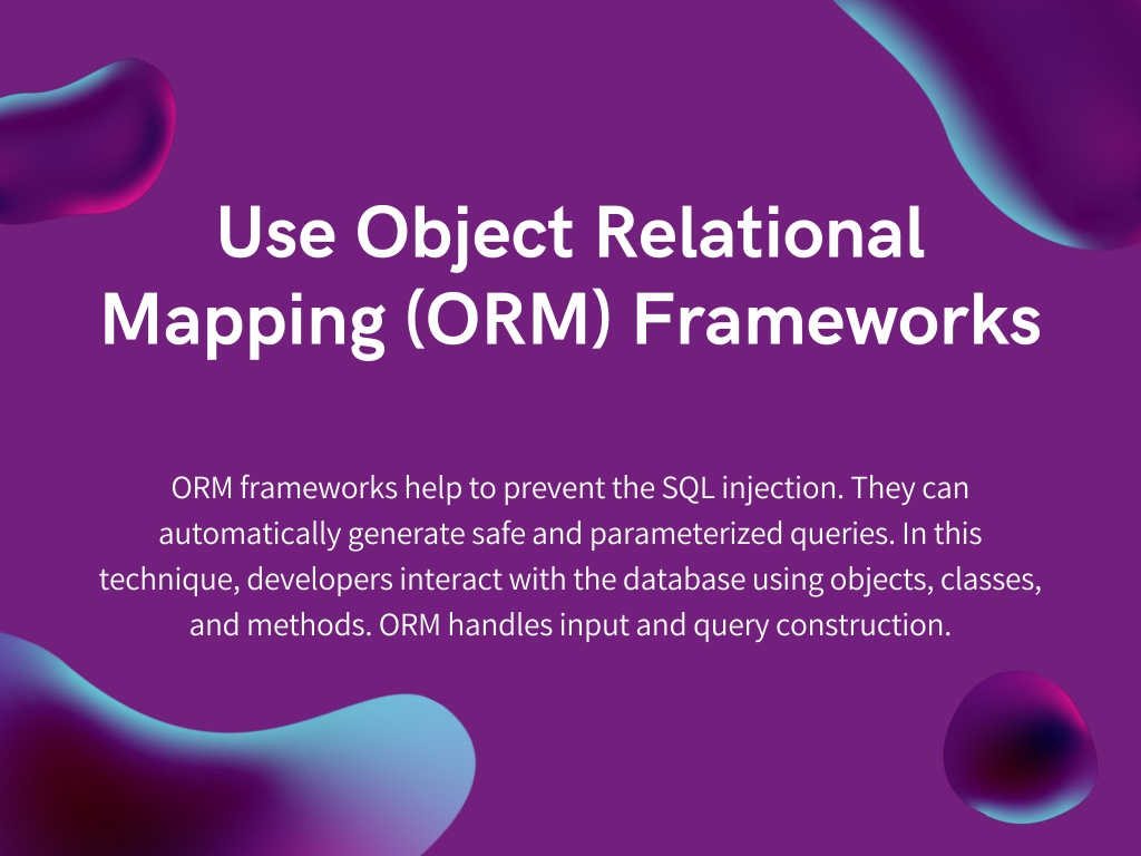 13. Use Object Relational Mapping (ORM) Frameworks ORM frameworks help to prevent the SQL injection. They can automatically generate safe and parameterized queries. In this technique, developers interact with the database using objects, classes, and methods. ORM handles input and query construction.
