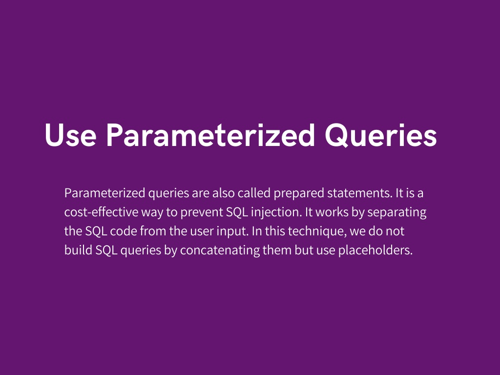 11. Use Parameterized Queries Parameterized queries are also called prepared statements. It is a cost-effective way to prevent SQL injection. It works by separating the SQL code from the user input. In this technique, we do not build SQL queries by concatenating them but use placeholders.