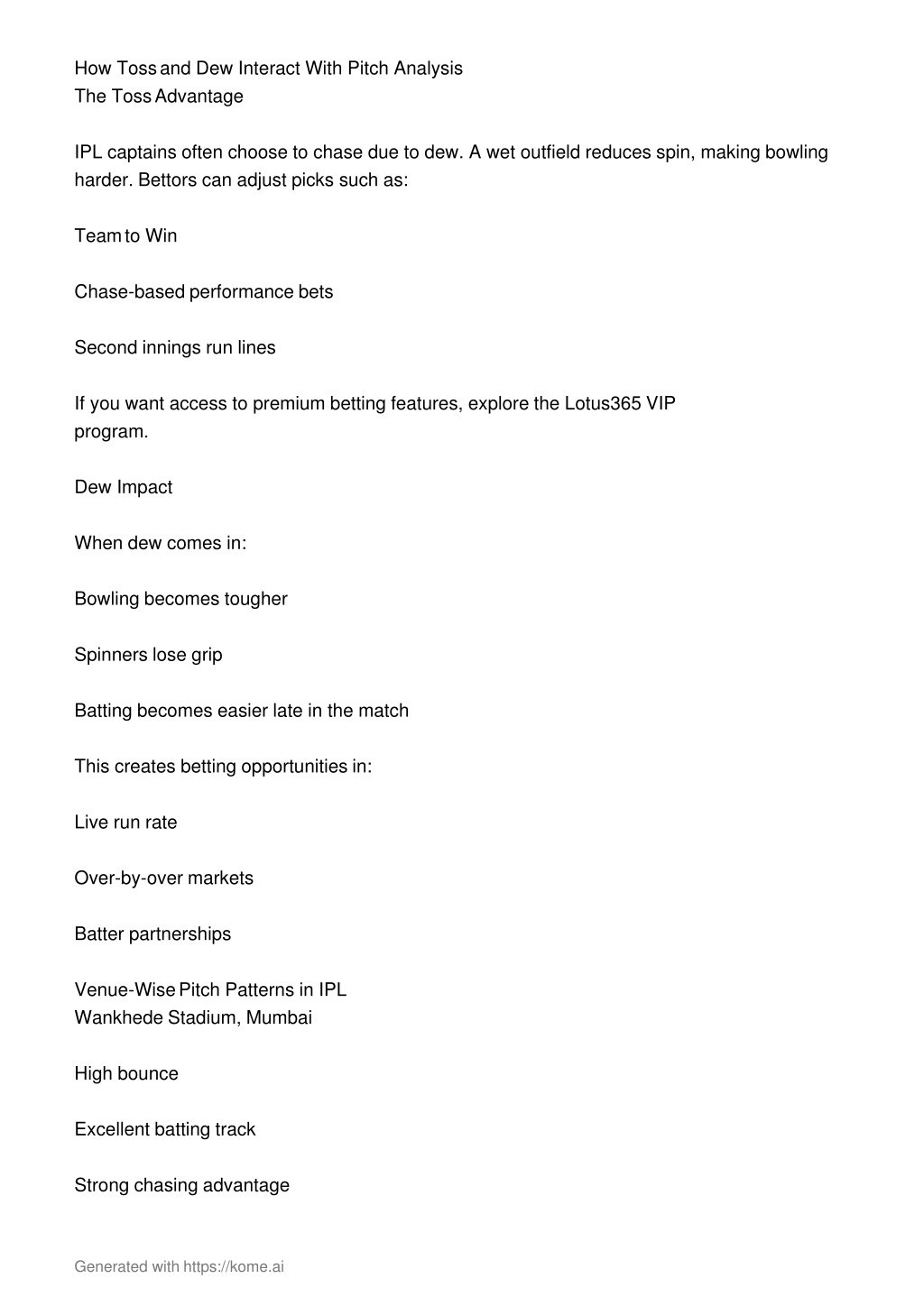 3. How Toss and Dew Interact With Pitch Analysis The Toss Advantage IPL captains often choose to chase due to dew. A wet outfield reduces spin, making bowling harder. Bettors can adjust picks such as: Team to Win Chase-based performance bets Second innings run lines If you want access to premium betting features, explore the Lotus365 VIP program. Dew Impact When dew comes in: Bowling becomes tougher Spinners lose grip Batting becomes easier late in the match This creates betting opportunities in: Live run rate Over-by-over markets Batter partnerships Venue-Wise Pitch Patterns in IPL Wankhede Stadium, Mumbai High bounce Excellent batting track Strong chasing advantage Generated with https://kome.ai