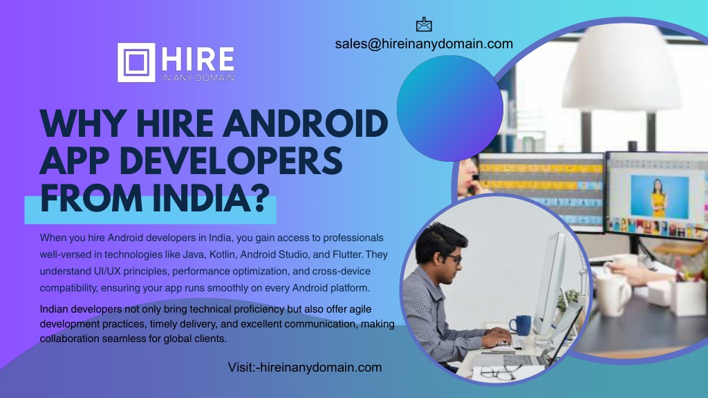 3. 📩 sales@hireinanydomain.com WHY HIRE ANDROID APP DEVELOPERS FROM INDIA? When you hire Android developers in India, you gain access to professionals well-versed in technologies like Java, Kotlin, Android Studio, and Flutter. They understand UI/UX principles, performance optimization, and cross-device compatibility, ensuring your app runs smoothly on every Android platform. Indian developers not only bring technical proficiency but also offer agile development practices, timely delivery, and excellent communication, making collaboration seamless for global clients. Visit:-hireinanydomain.com