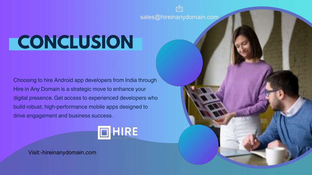 5. 📩 sales@hireinanydomain.com CONCLUSION Choosing to hire Android app developers from India through Hire in Any Domain is a strategic move to enhance your digital presence. Get access to experienced developers who build robust, high-performance mobile apps designed to drive engagement and business success. Visit:-hireinanydomain.com