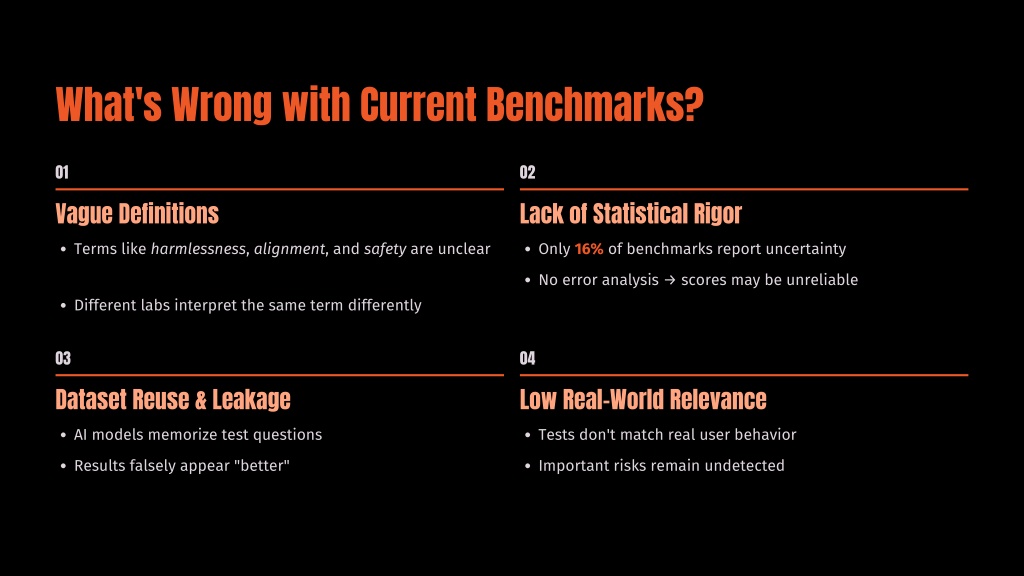 5. What's Wrong with Current Benchmarks? 01 02 Vague Definitions Lack of Statistical Rigor Terms like harmlessness, alignment, and safety are unclear Only 16%of benchmarks report uncertainty No error analysis → scores may be unreliable Different labs interpret the same term differently 03 04 Dataset Reuse & Leakage Low Real-World Relevance AI models memorize test questions Tests don't match real user behavior Results falsely appear "better" Important risks remain undetected
