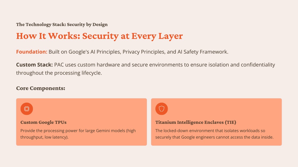 The Technology Stack: Security by Design How It Works: Security at Every Layer Foundation:Built on Google's AI Principles, Privacy Principles, and AI Safety Framework. Custom Stack: PAC uses custom hardware and secure environments to ensure isolation and confidentiality throughout the processing lifecycle. Core Components: Custom Google TPUs Titanium Intelligence Enclaves (TIE) Provide the processing power for large Gemini models (high throughput, low latency). The locked-down environment that isolates workloads so securely that Google engineers cannot access the data inside.