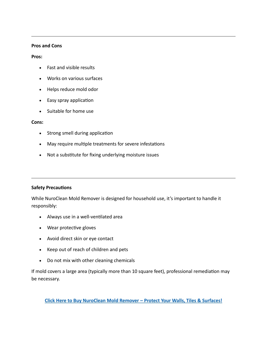 Pros and Cons Pros: •Fast and visible results •Works on various surfaces •Helps reduce mold odor •Easy spray applicatjon •Suitable for home use Cons: •Strong smell during applicatjon •May require multjple treatments for severe infestatjons •Not a substjtute for fjxing underlying moisture issues Safety Precautjons While NuroClean Mold Remover is designed for household use, it’s important to handle it responsibly: •Always use in a well-ventjlated area •Wear protectjve gloves •Avoid direct skin or eye contact •Keep out of reach of children and pets •Do not mix with other cleaning chemicals If mold covers a large area (typically more than 10 square feet), professional remediatjon may be necessary. Click Here to Buy NuroClean Mold Remover – Protect Your Walls, Tiles & Surfaces!