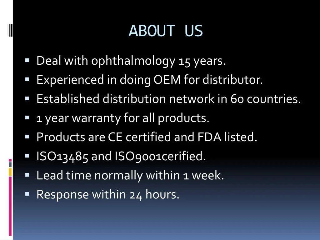 ABOUT US ▪ Deal with ophthalmology 15 years. ▪ Experienced in doing OEM for distributor. ▪ Established distribution network in 60 countries. ▪ 1 year warranty for all products. ▪ Products are CE certified and FDA listed. ▪ ISO13485 and ISO9001cerified. ▪ Lead time normally within 1 week. ▪ Response within 24 hours.