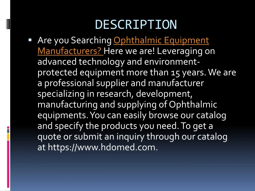 DESCRIPTION ▪ Are you Searching Ophthalmic Equipment Manufacturers? Here we are! Leveraging on advanced technology and environment- protected equipment more than 15 years. We are a professional supplier and manufacturer specializing in research, development, manufacturing and supplying of Ophthalmic equipments. You can easily browse our catalog and specify the products you need. To get a quote or submit an inquiry through our catalog at https://www.hdomed.com.