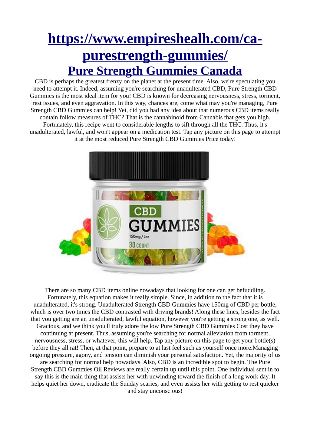 https://www.empireshealh.com/ca- purestrength-gummies/ Pure Strength Gummies Canada CBD is perhaps the greatest frenzy on the planet at the present time. Also, we're speculating you need to attempt it. Indeed, assuming you're searching for unadulterated CBD, Pure Strength CBD Gummies is the most ideal item for you! CBD is known for decreasing nervousness, stress, torment, rest issues, and even aggravation. In this way, chances are, come what may you're managing, Pure Strength CBD Gummies can help! Yet, did you had any idea about that numerous CBD items really contain follow measures of THC? That is the cannabinoid from Cannabis that gets you high. Fortunately, this recipe went to considerable lengths to sift through all the THC. Thus, it's unadulterated, lawful, and won't appear on a medication test. Tap any picture on this page to attempt it at the most reduced Pure Strength CBD Gummies Price today! There are so many CBD items online nowadays that looking for one can get befuddling. Fortunately, this equation makes it really simple. Since, in addition to the fact that it is unadulterated, it's strong. Unadulterated Strength CBD Gummies have 150mg of CBD per bottle, which is over two times the CBD contrasted with driving brands! Along these lines, besides the fact that you getting are an unadulterated, lawful equation, however you're getting a strong one, as well. Gracious, and we think you'll truly adore the low Pure Strength CBD Gummies Cost they have continuing at present. Thus, assuming you're searching for normal alleviation from torment, nervousness, stress, or whatever, this will help. Tap any picture on this page to get your bottle(s) before they all rat! Then, at that point, prepare to at last feel such as yourself once more.Managing ongoing pressure, agony, and tension can diminish your personal satisfaction. Yet, the majority of us are searching for normal help nowadays. Also, CBD is an incredible spot to begin. The Pure Strength CBD Gummies Oil Reviews are really certain up until this point. One individual sent in to say this is the main thing that assists her with unwinding toward the finish of a long work day. It helps quiet her down, eradicate the Sunday scaries, and even assists her with getting to rest quicker and stay unconscious!